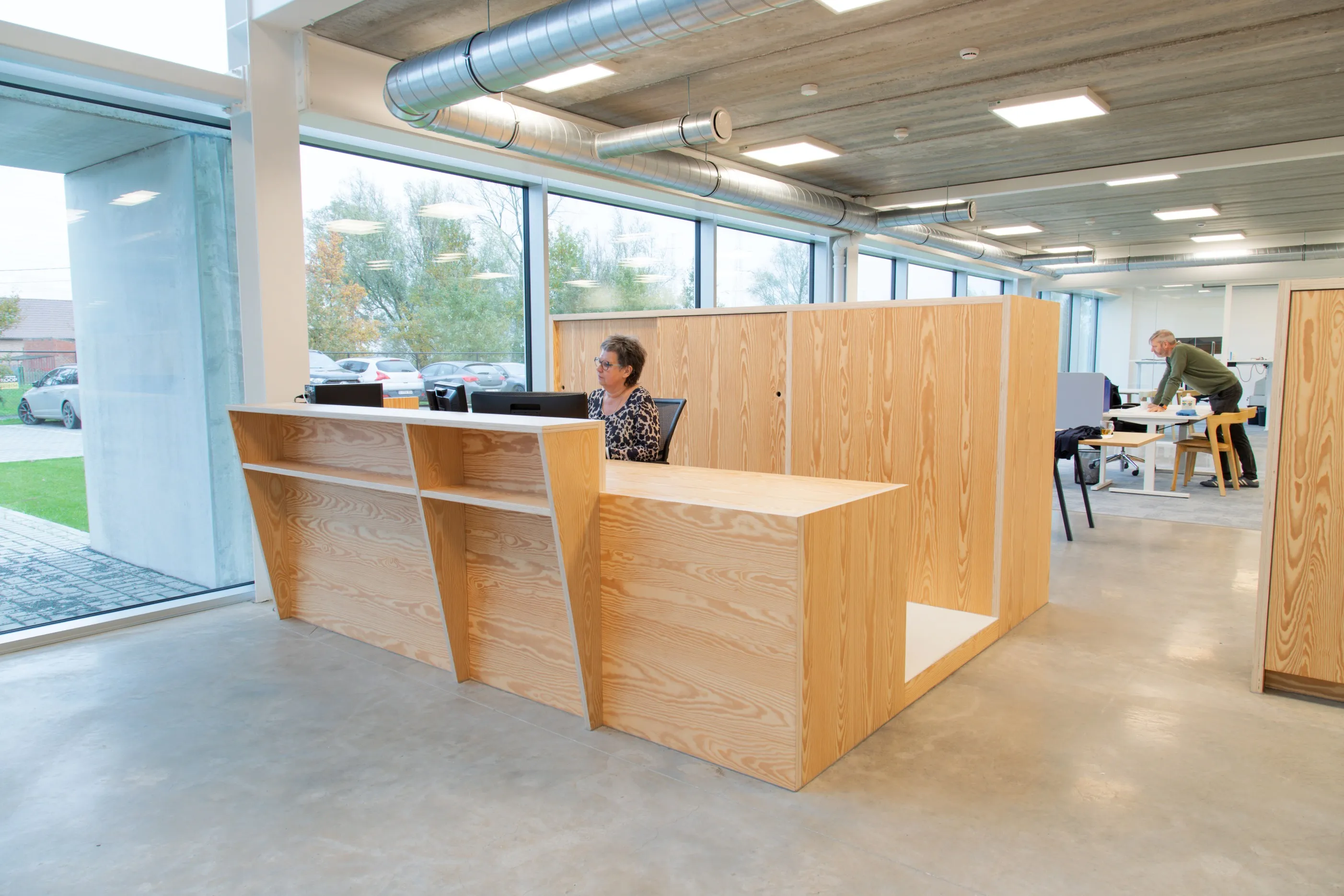 De showroom op de verdieping is georganiseerd rond een patio die dienst doet als beleving- en ontmoetingsruimte. Strategische doorzichten naar de hypermoderne productiehal stellen het vakmanschap tentoon, de verbinding met het cliënteel staat centraal.