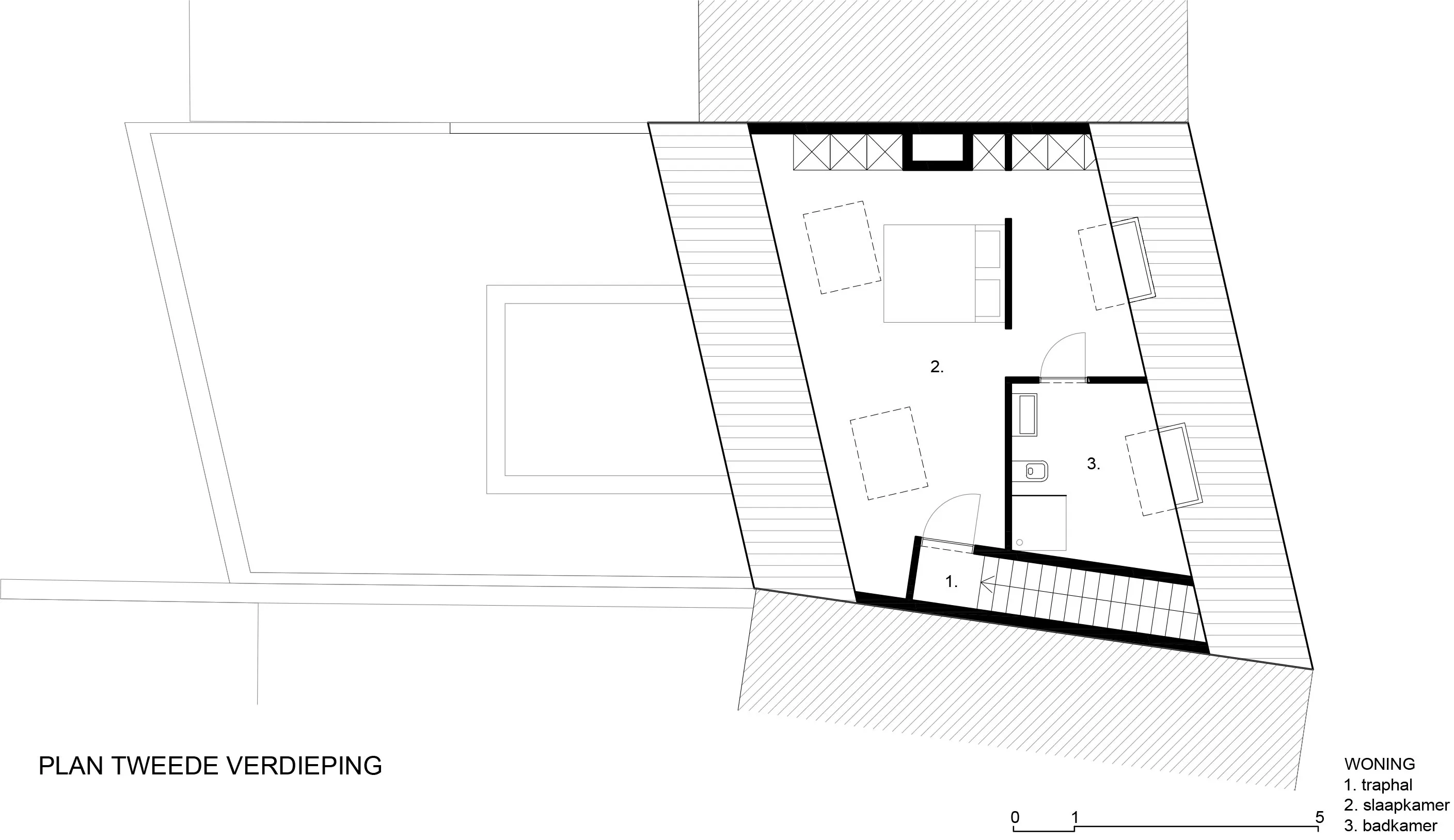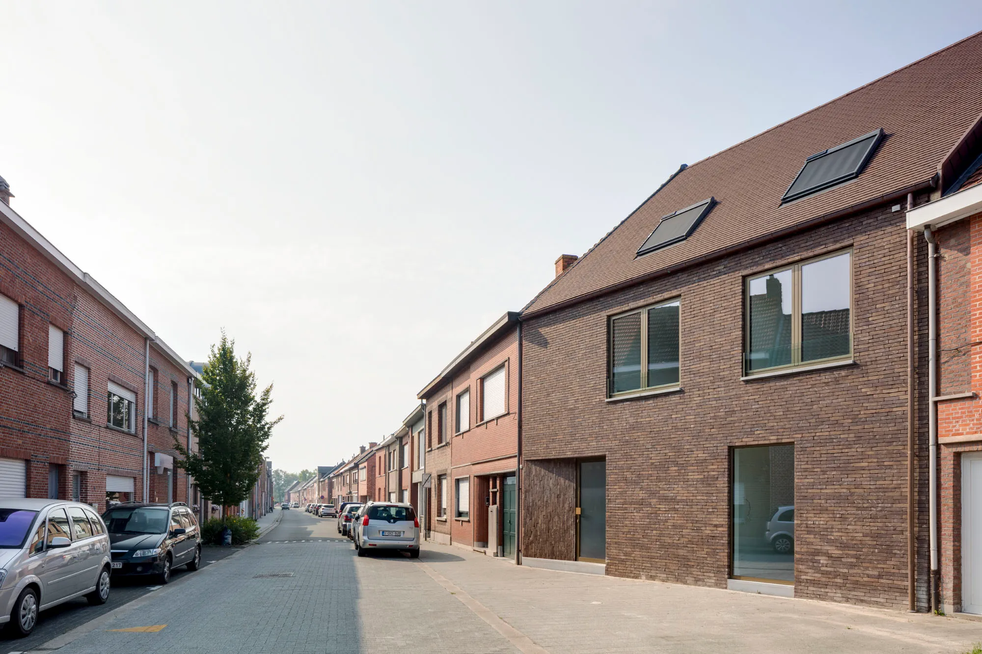 Het elegante ontwerp verenigt de schuine perceelsgrenzen en de verspringende voorgevellijnen van de buren, waarbij een mooi staaltje vakmanschap van metsers en dakwerkers getoond wordt. De gevelsteen en dakpannen in dezelfde kleurtint in combinatie met het brons geanodiseerde gevelschrijnwerk geven de woning haar hedendaagse eigenheid. De terugplooiende gevelpartij die de inkom markeert, nodigt uit tot binnenkomen.