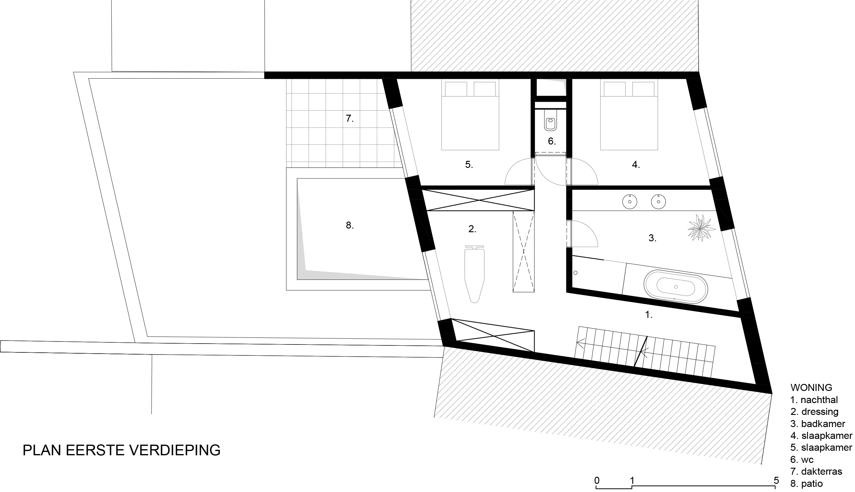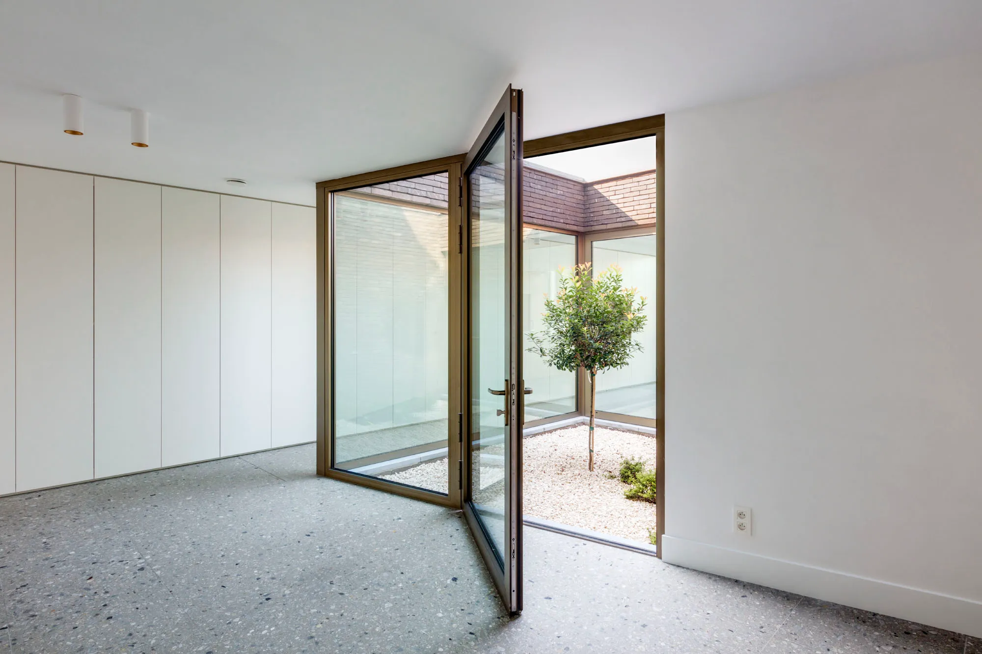 In het midden van de woning doorbreekt de patio de diepte van de rijwoning en zorgt ze voor licht, lucht en groen. De verdiepingshoge beglazing en het strakke maatwerkinterieur dragen bij tot het harmonieuze en royale gevoel van ruimtelijkheid. Het platte dak van de achterbouw wordt als dakterras ingericht voor de bovenwoning.
