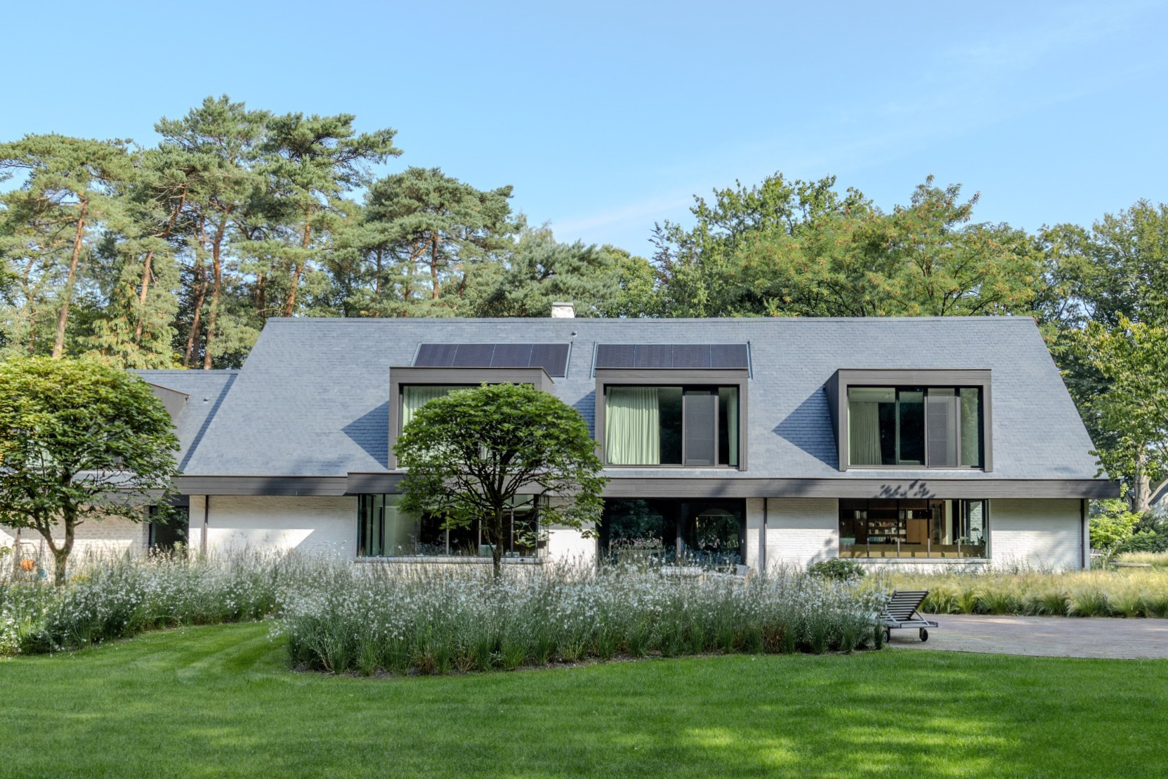 De meest opvallende aanpassing situeert zich op het dak: 4 nieuwe grote dakkapellen bieden panoramisch zicht op de tuin. Een nieuwe maatgevende kroonlijst verbindt de individuele ingrepen zodat de woning opnieuw als een geheel kan worden gelezen.