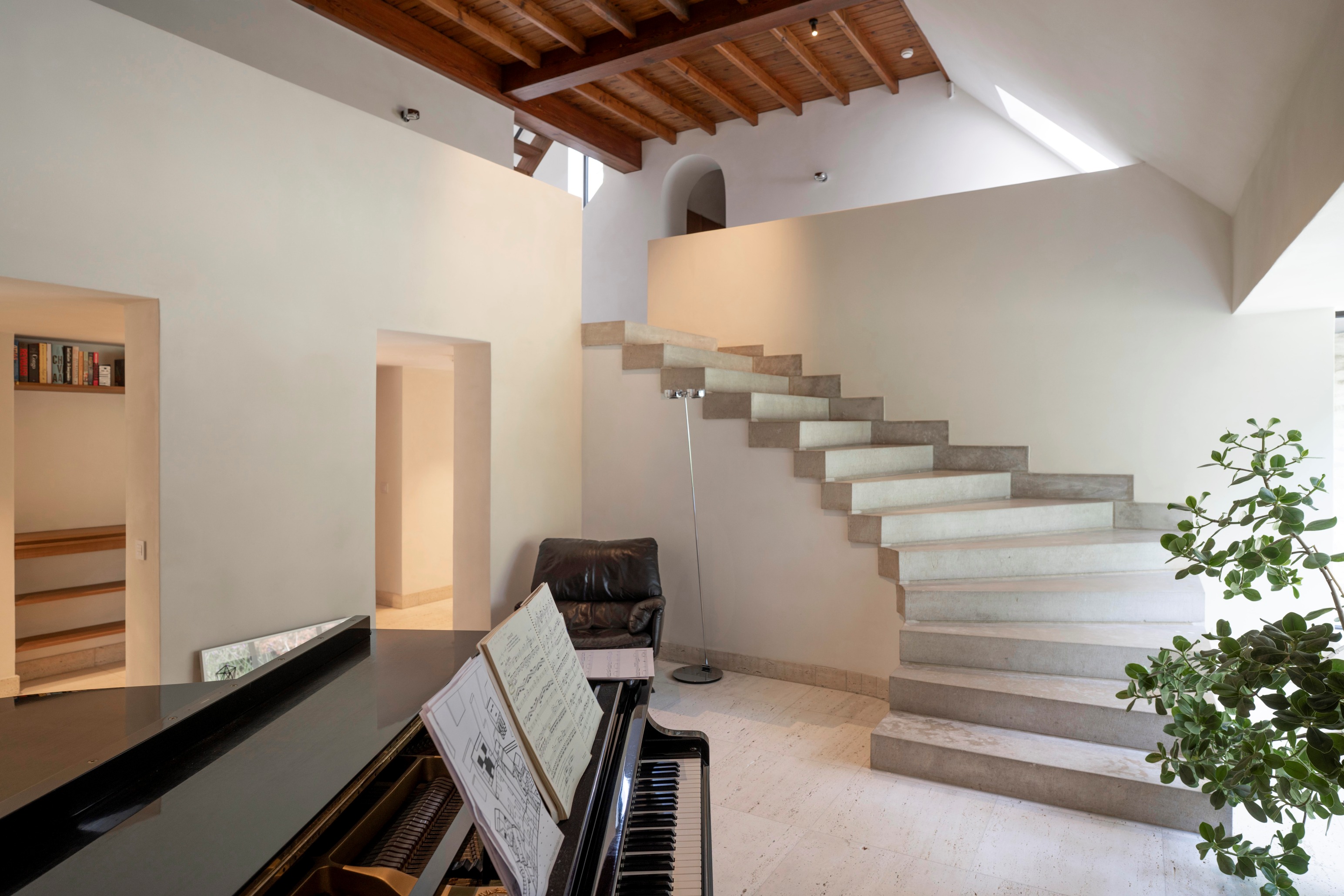 Het interieur wordt met een selectie aan bio-based materialen afgewerkt; leempleister met witte finish vormt de afwerklaag op de wanden, dit natuurlijke materiaal versterkt de vochtregulerende eigenschappen van de kalkhennep. Op de verdieping wordt een Terrafloor geplaatst, een hand gepleisterde mortelvloer bestaande uit natuurlijke gipsen en kalk. Het uitgekiende maatmeubilair in Afrormosia versterkt het coherent geheel.