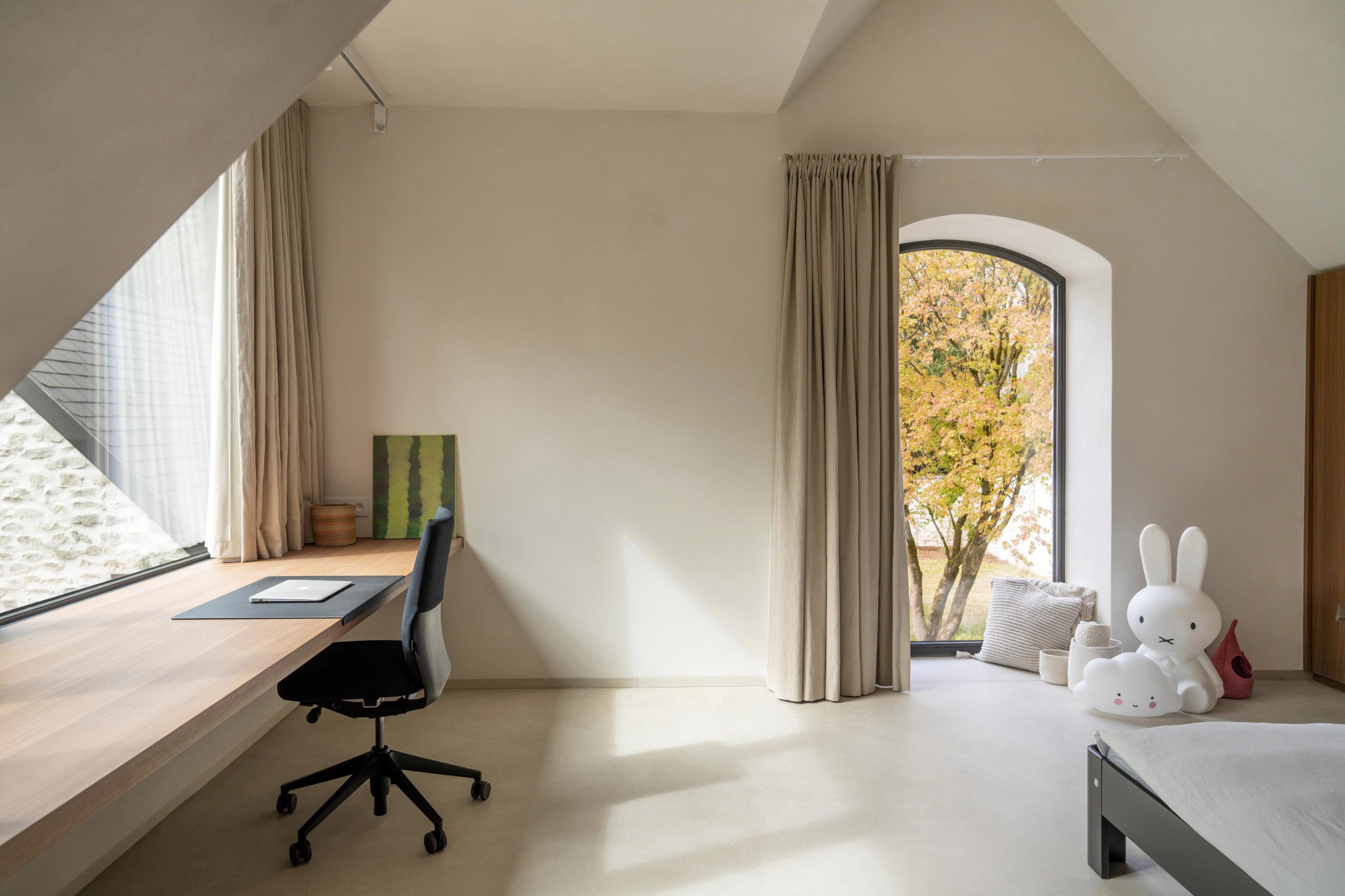Een kamerbrede inkomdeur biedt toegang tot de originele centrale circulatie-as die alle gelijkvloerse vertrekken verbindt. Thuiskantoor, zithoek en eetkeuken krijgen royaal ruimte. Versnipperde kamers op de verdieping werden herschikt om 3 gelijkwaardige kinderkamers en een zone voor de ouders te organiseren.