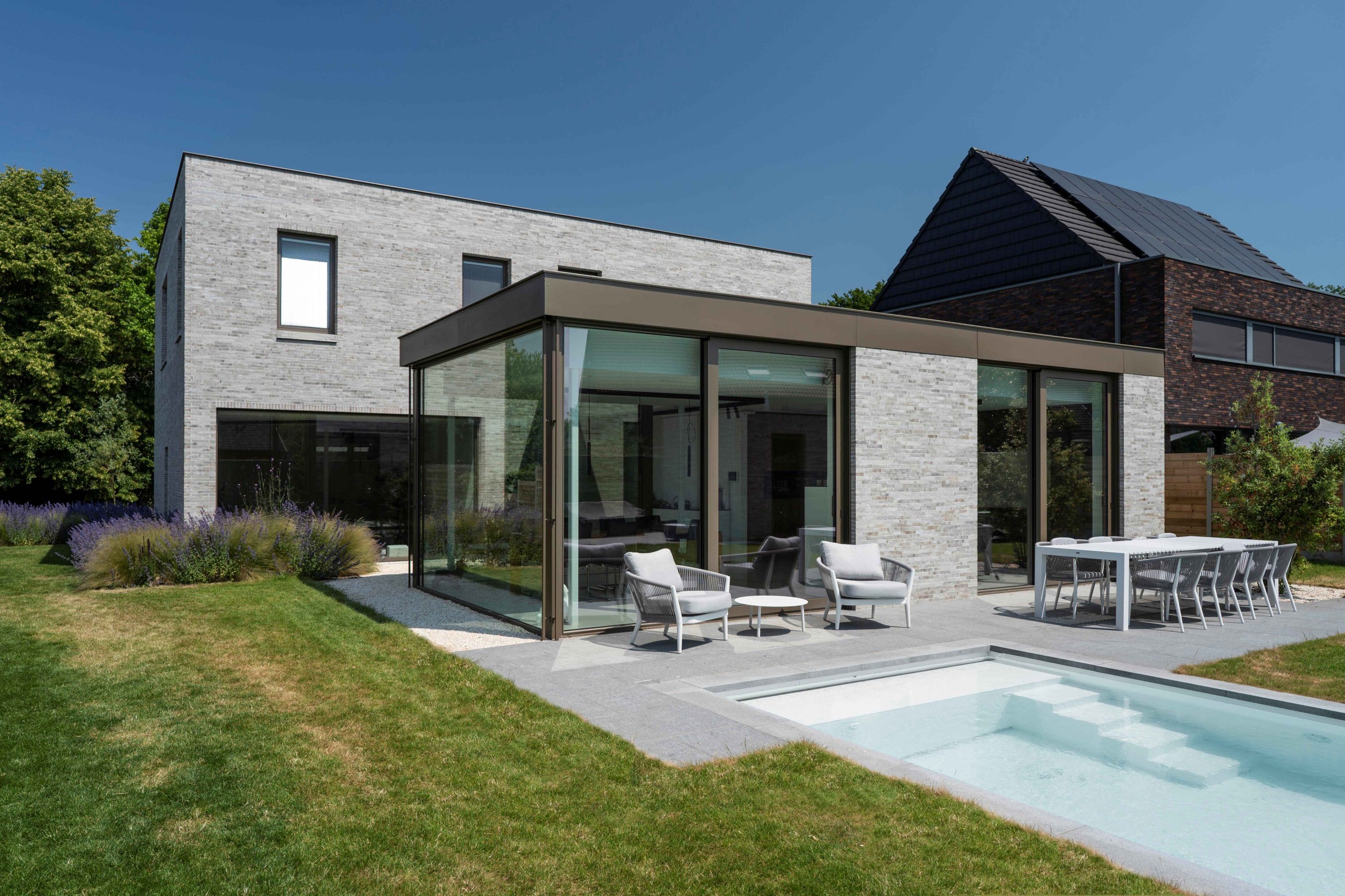 De witte gevelsteen, de zonwerende buitenjaloezieën en het blauwe wateroppervlak van het zwembad geven de woning een zuiders cachet.