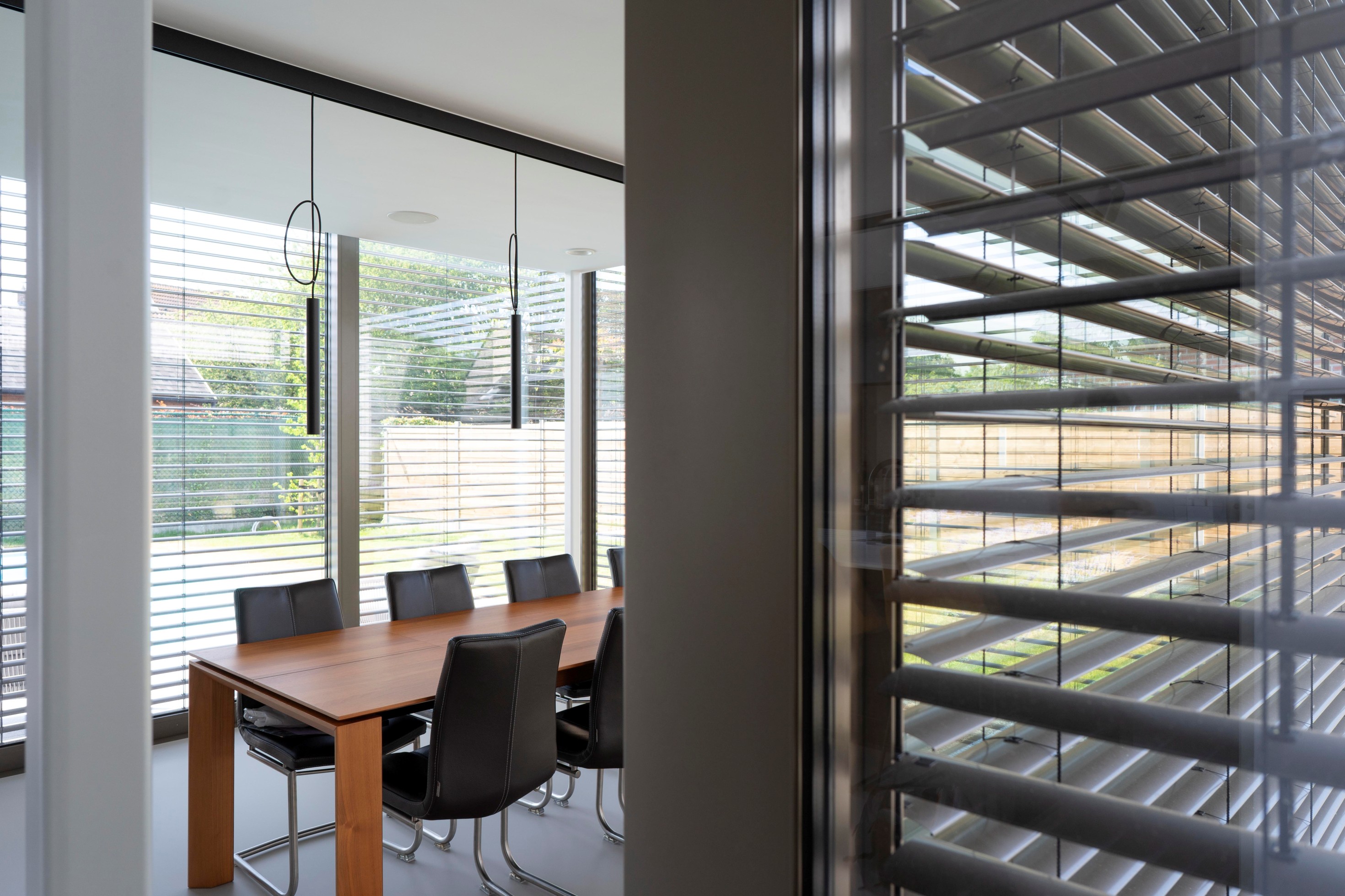De eetruimte met open leefkeuken richt zich langs 3 zijden op de achter- en zijtuin en de halfopen patio. Achteraan de tuin is er het genot van het terras met zwembad, in de zijtuin speelt het groen de hoofdrol en filtert in de patio het zicht tussen eetkamer en zithoek. De woonkamer wordt als zitput uitgevoerd waardoor deze zijn intimiteit bewaart naast het binnenkomen.