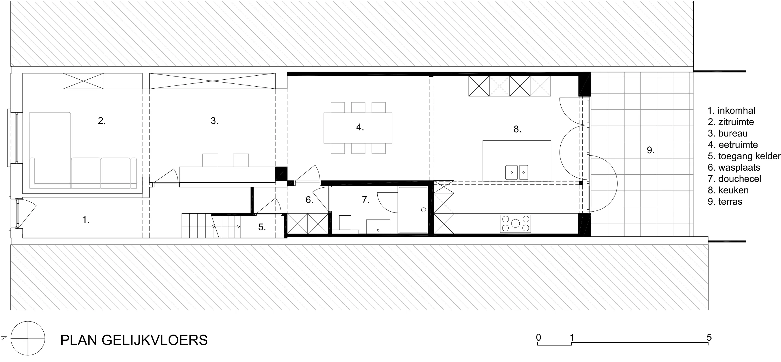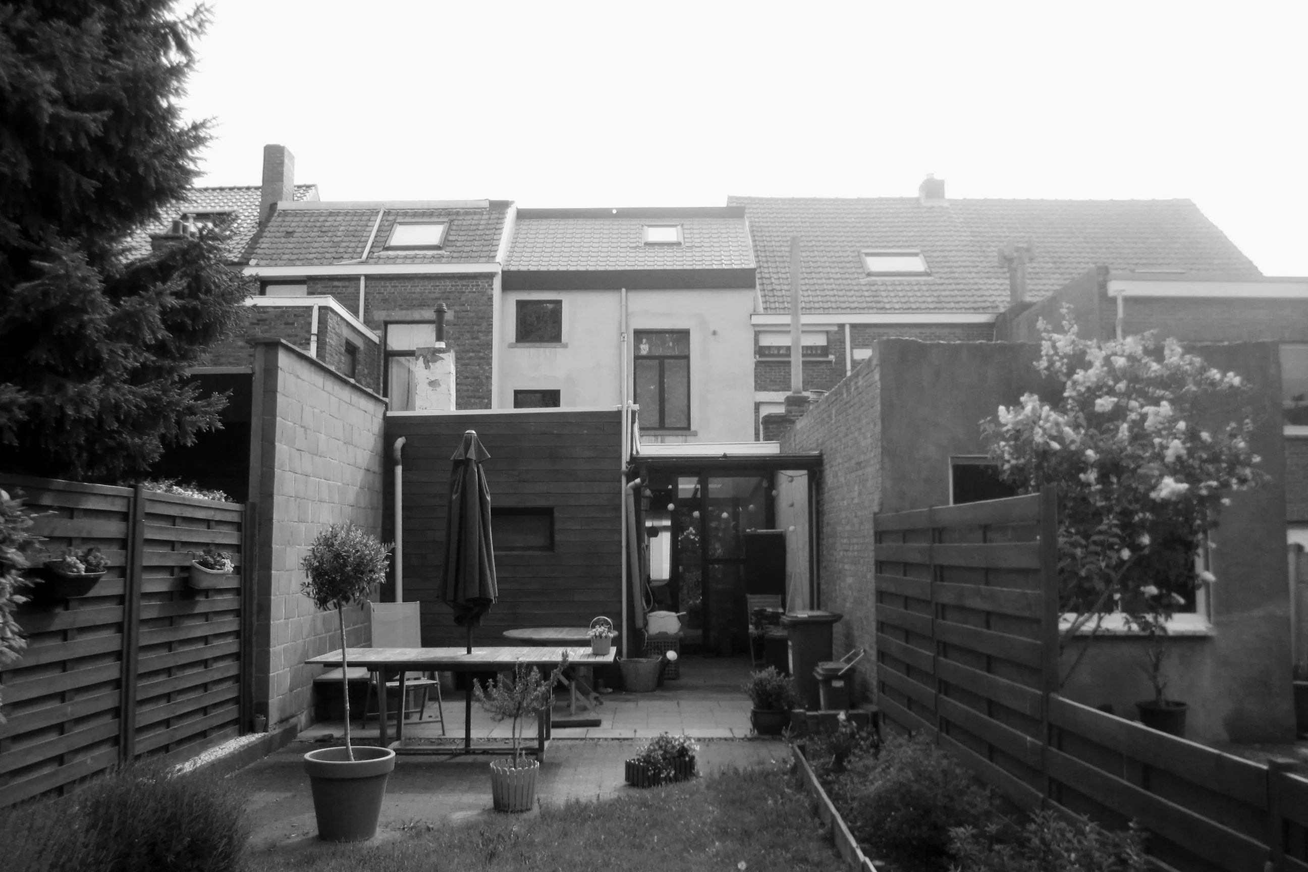 Een bestaande rijwoning van 5m breed kent een klassieke indeling: gelijkvloerse leefruimtes aan de straat met daarachter badkamer en bergingen. Om de verscholen tuin terug te vinden, wordt uitbouw na uitbouw gesloopt en in één beweging de schaarse lichtinval gemaximaliseerd.