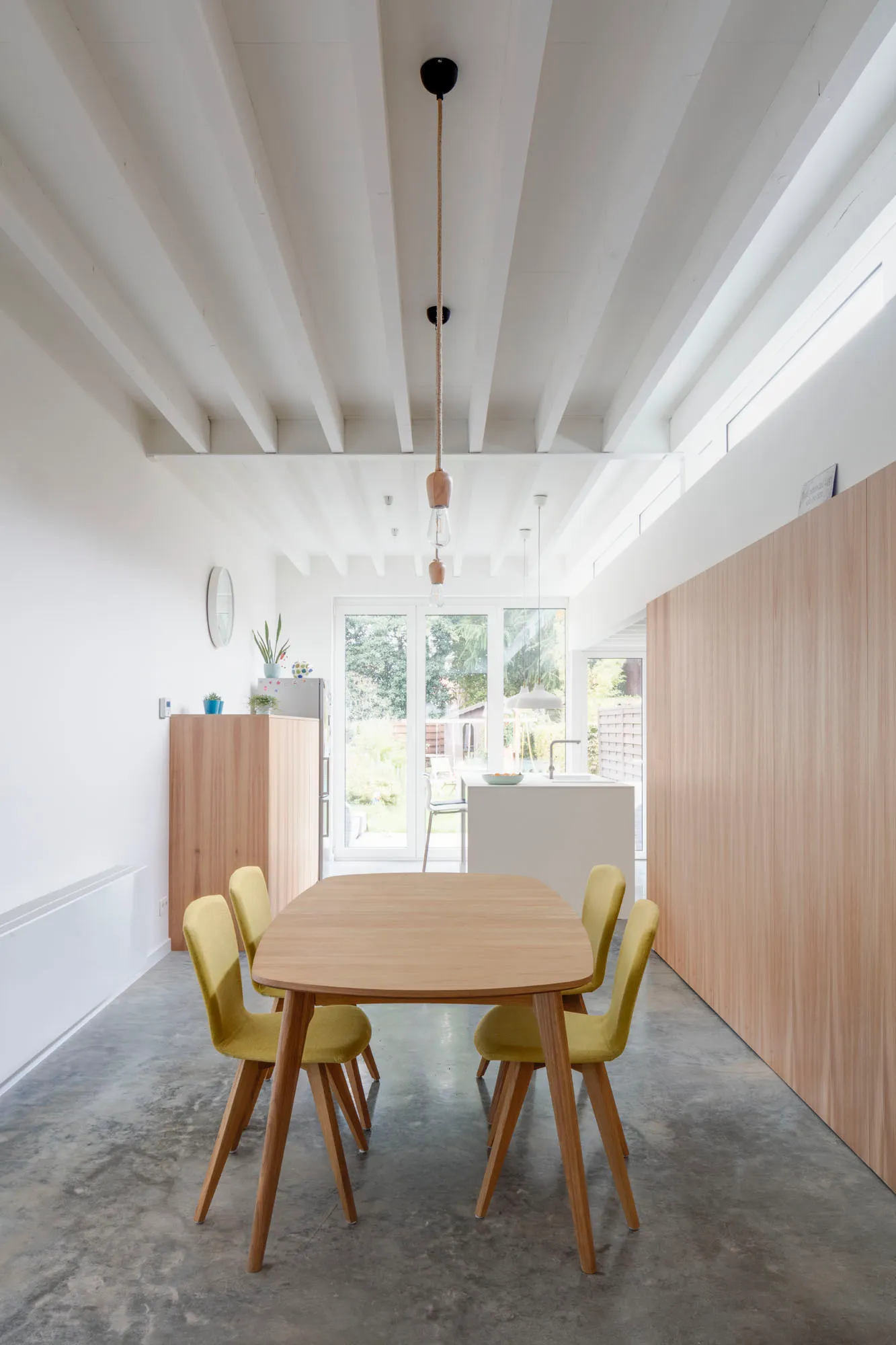 In deze ruimte worden een heldere eethoek en keuken ingericht. In de donkere kern van de woning wordt een nieuwe douchecel voorzien. Deze kern wordt bekleed met rode olm-fineer dat aan de sobere witte keuken en eetkamer met betonvloer een warm karakter verleent. De houten balkenstructuur van het dak blijft zichtbaar en wordt wit geschilderd.