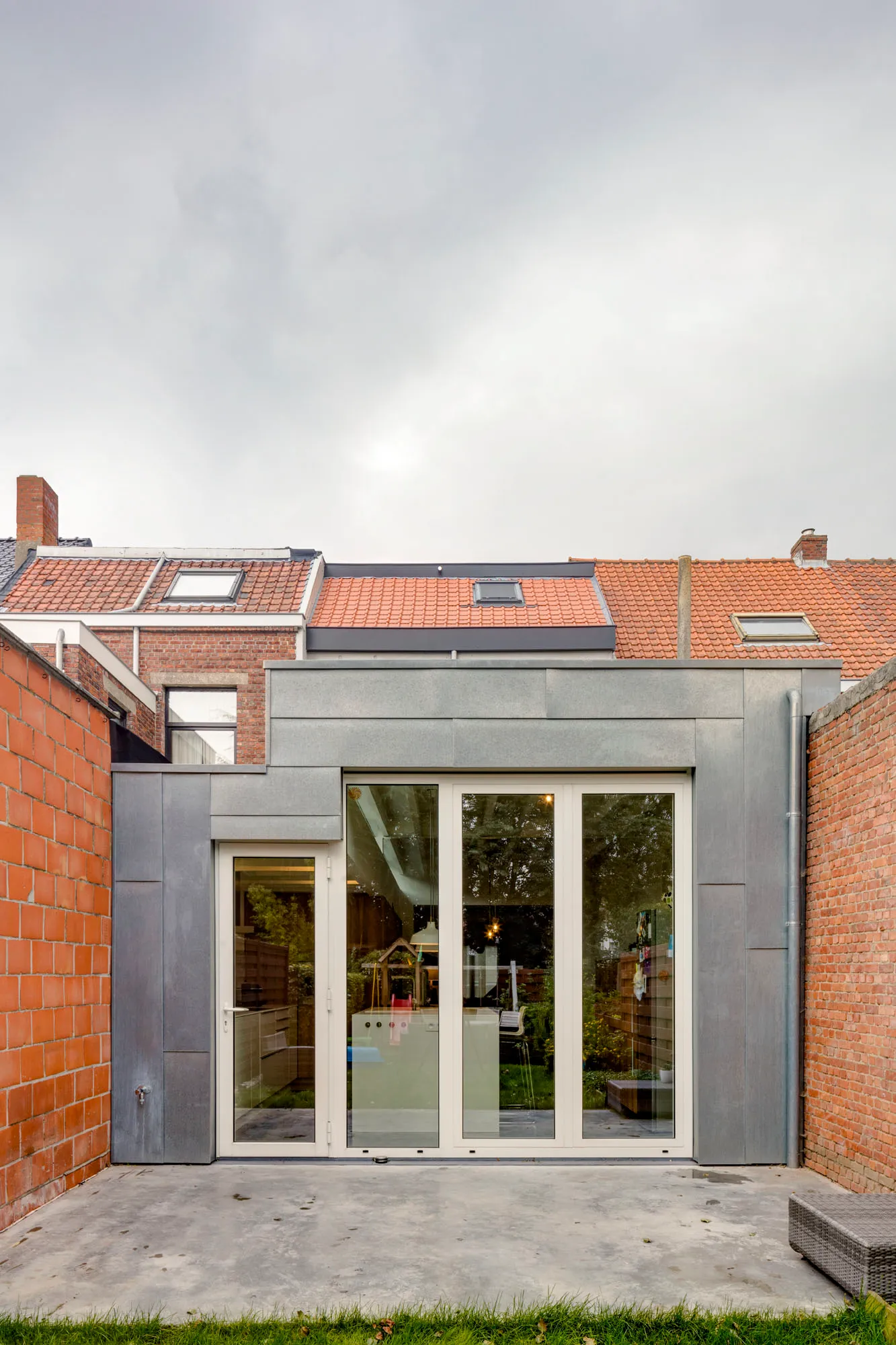 De puzzel van zinken gevelpanelen tegen de achtergevel geeft bijkomend aandacht aan de eerlijk zichtbare materiaalkeuzes.