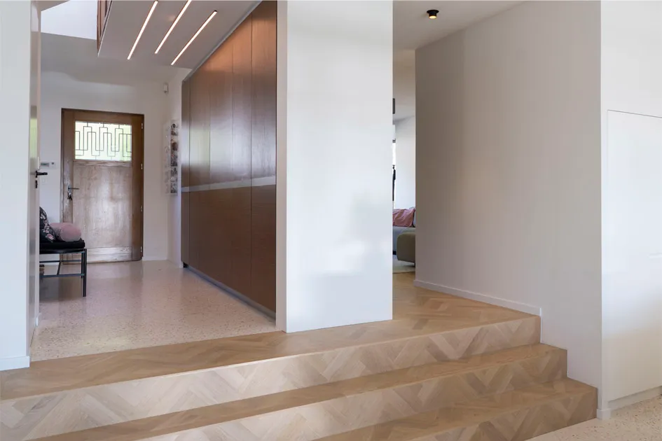 Van hieraf wordt een nieuw volume opgetrokken met dezelfde stijlkenmerken, zij het op een hedendaagse manier gedetailleerd. Eenzelfde elegantie evenaren was enkel mogelijk gebruikmakend van massief houten CLT wand- en vloerplaten die binnen-buiten doorlopen om de kenmerkende oversteken te realiseren. Er werd gezocht naar de oude gevelstenen om zonder zichtbare overgangen verder te bouwen.