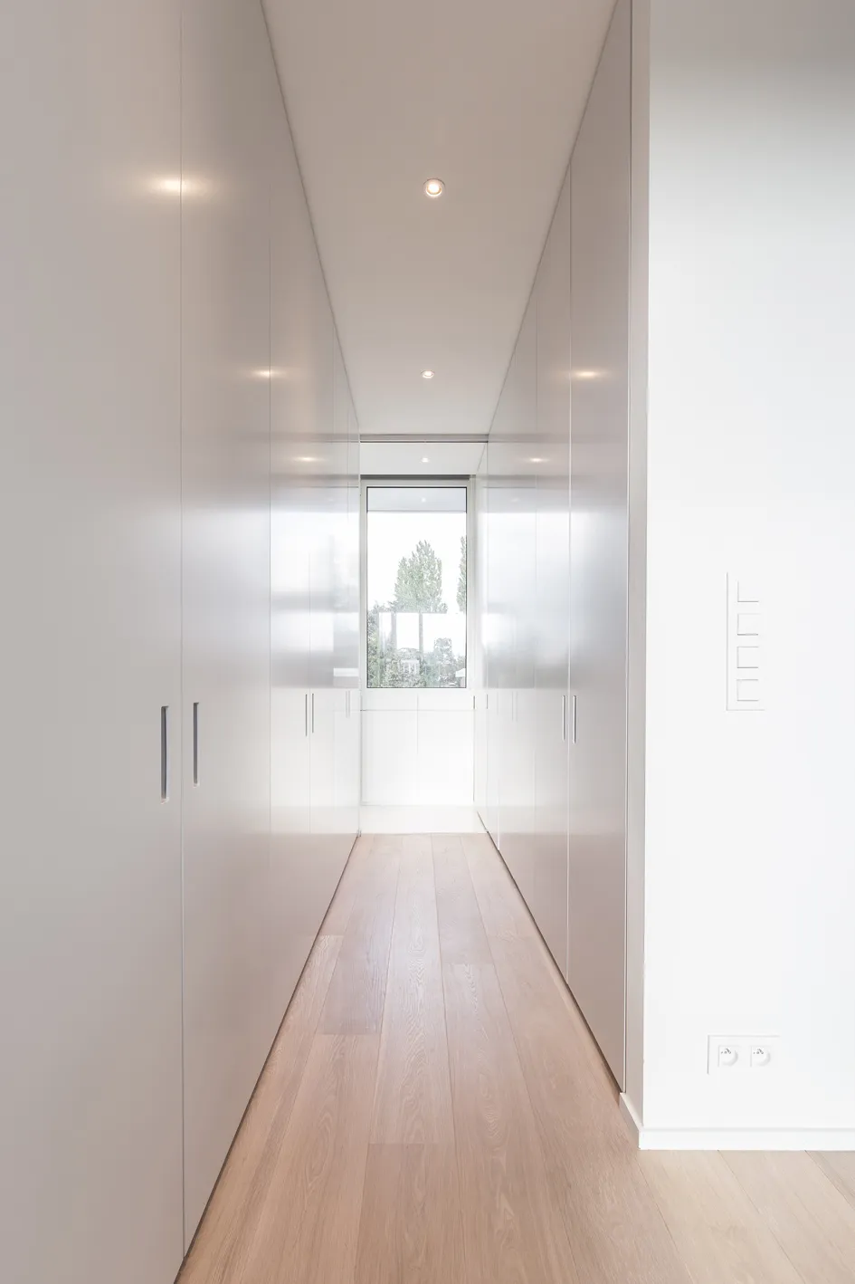 De nieuwe verdieping wordt een plek exclusief voor de ouders. Slaapkamer, dressing en badkamer worden zo georganiseerd dat er vrije circulatie ontstaat tussen deze functies. Dit maakt het mogelijk om op een logische manier het ochtend- of avondritueel te doorlopen zonder dat dit de rust van de slaapkamer in het gedrang brengt.