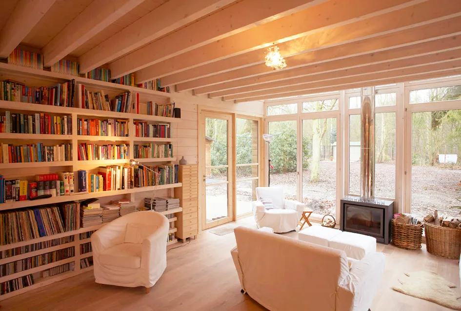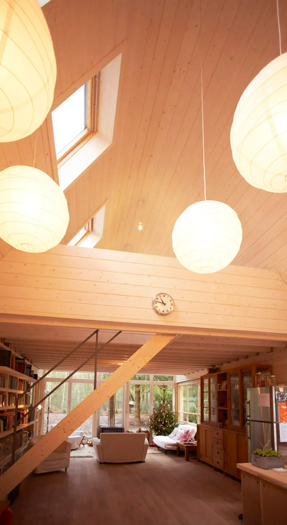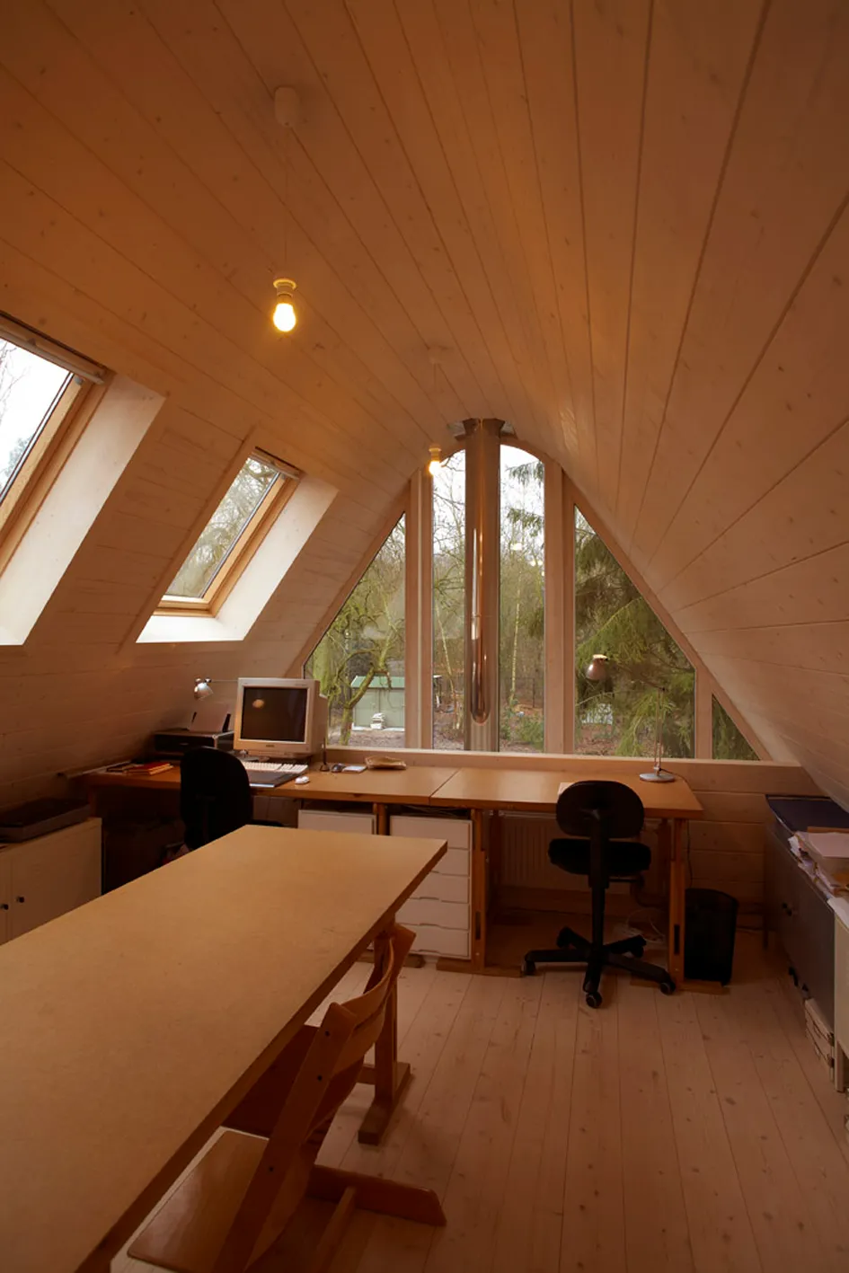 Er wordt gewoond tussen de bomen op het gelijkvloers en gewerkt in de kruinen op de verdieping. Alles is compact gehouden met slimme opbergmogelijkheden. Het open plan zorgt ervoor dat de woning groter aanvoelt dan ze eigenlijk is.