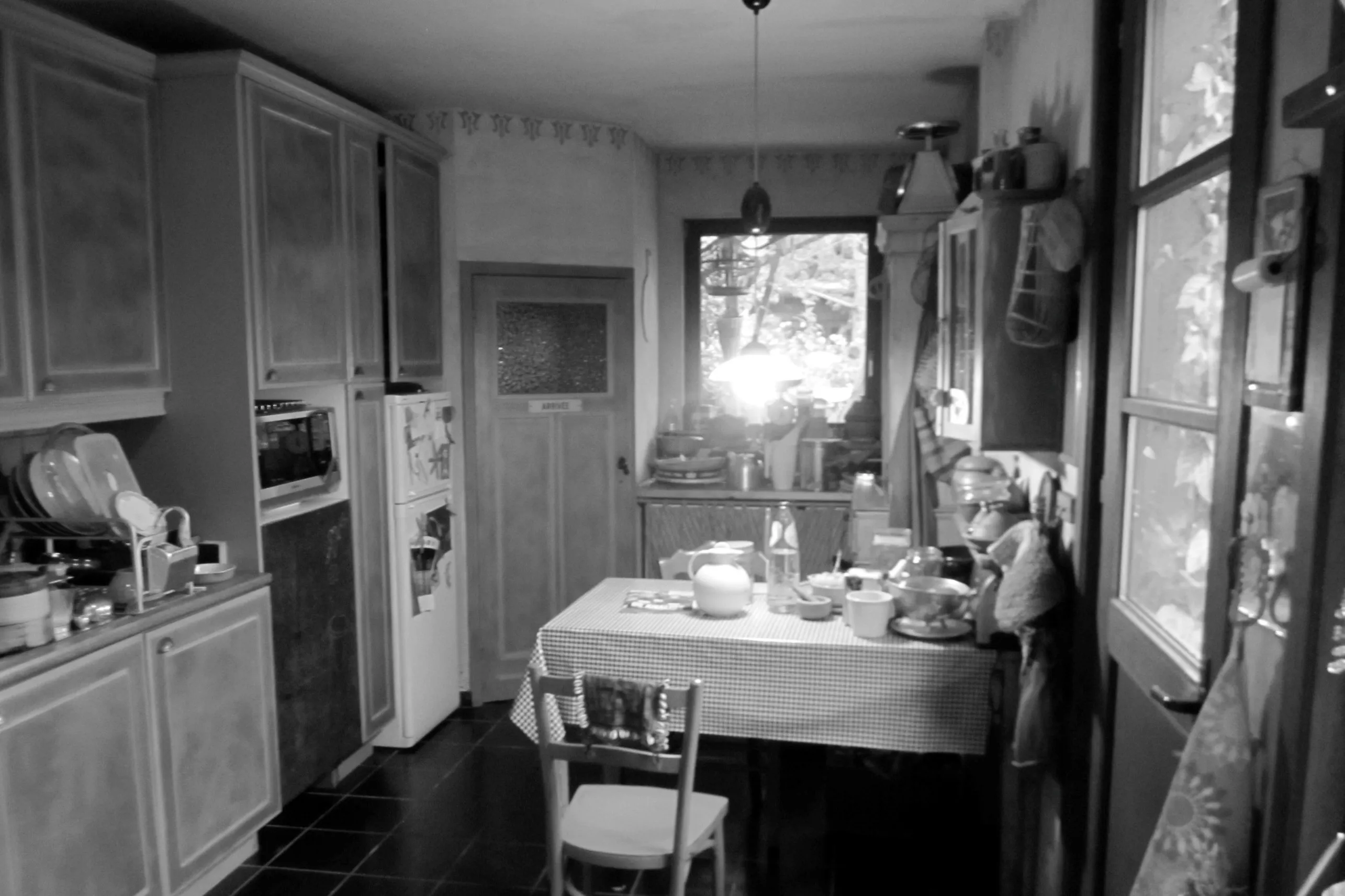 In een diepe achterbouw werden doorheen de jaren keuken, wasplaats, gastentoilet en eetruimte georganiseerd. Het verplaatsen van de meer gesloten functies naar de donkerste hoek van de woning en het openwerken van de gevels is een logische ingreep.