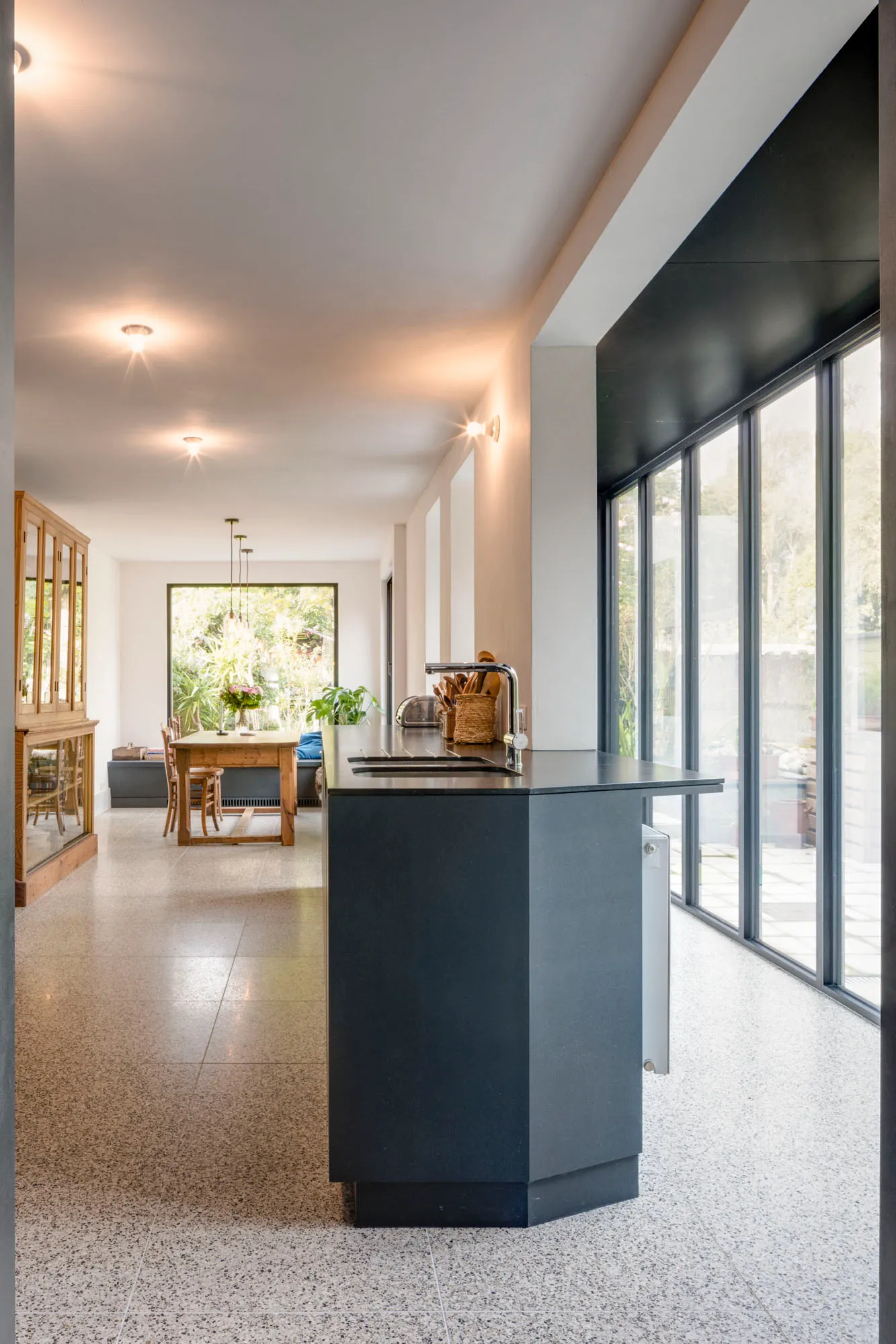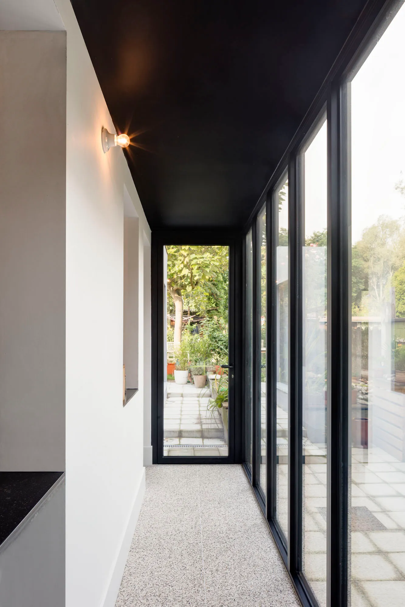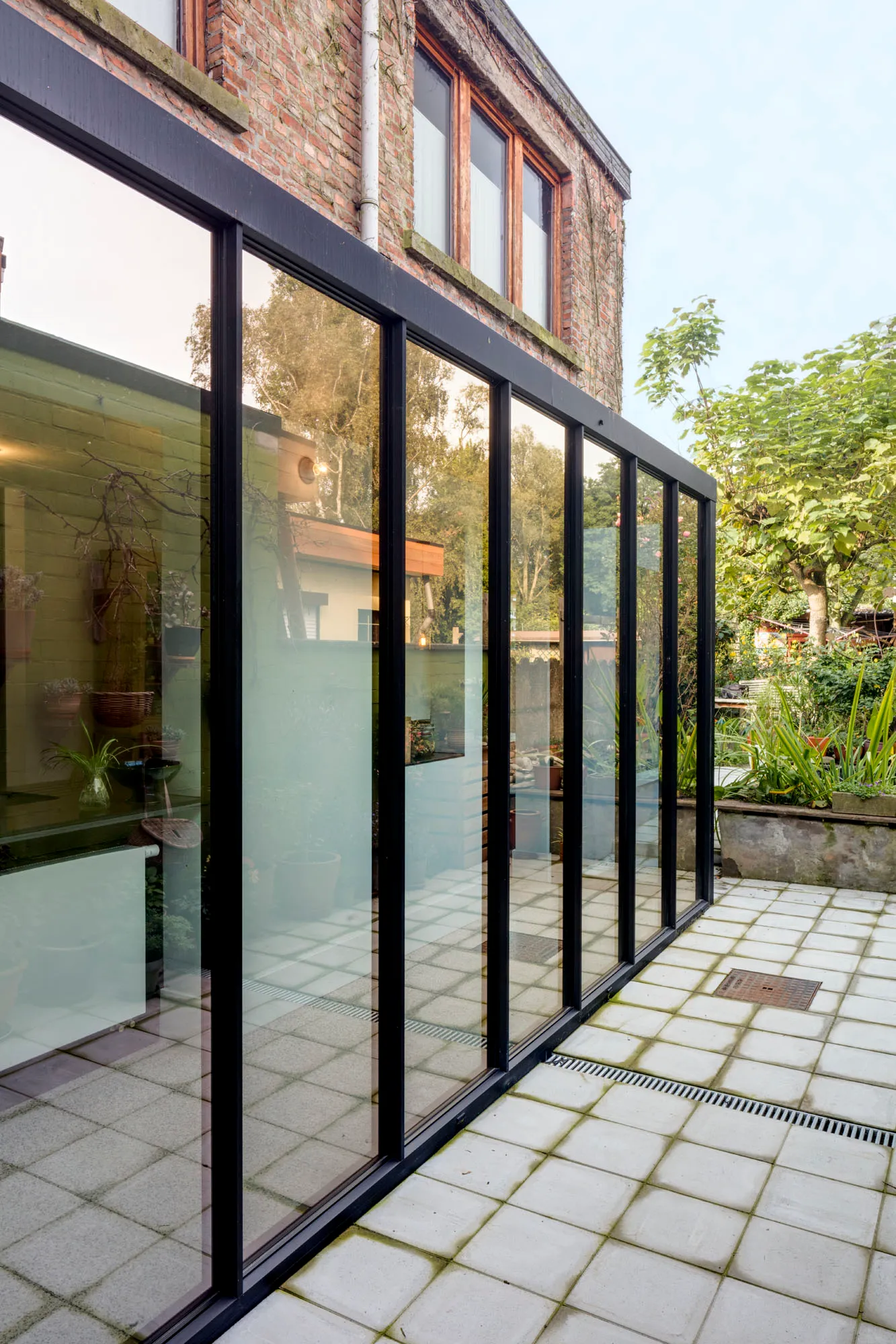 Door het aanbouwen van een glazen volume tegen de zijgevel wordt de achterbouw pas echt interessant. Er ontstaat een gaanderij met uitzicht op de ingesloten buitenruimte die zich ontplooit als groene patio.