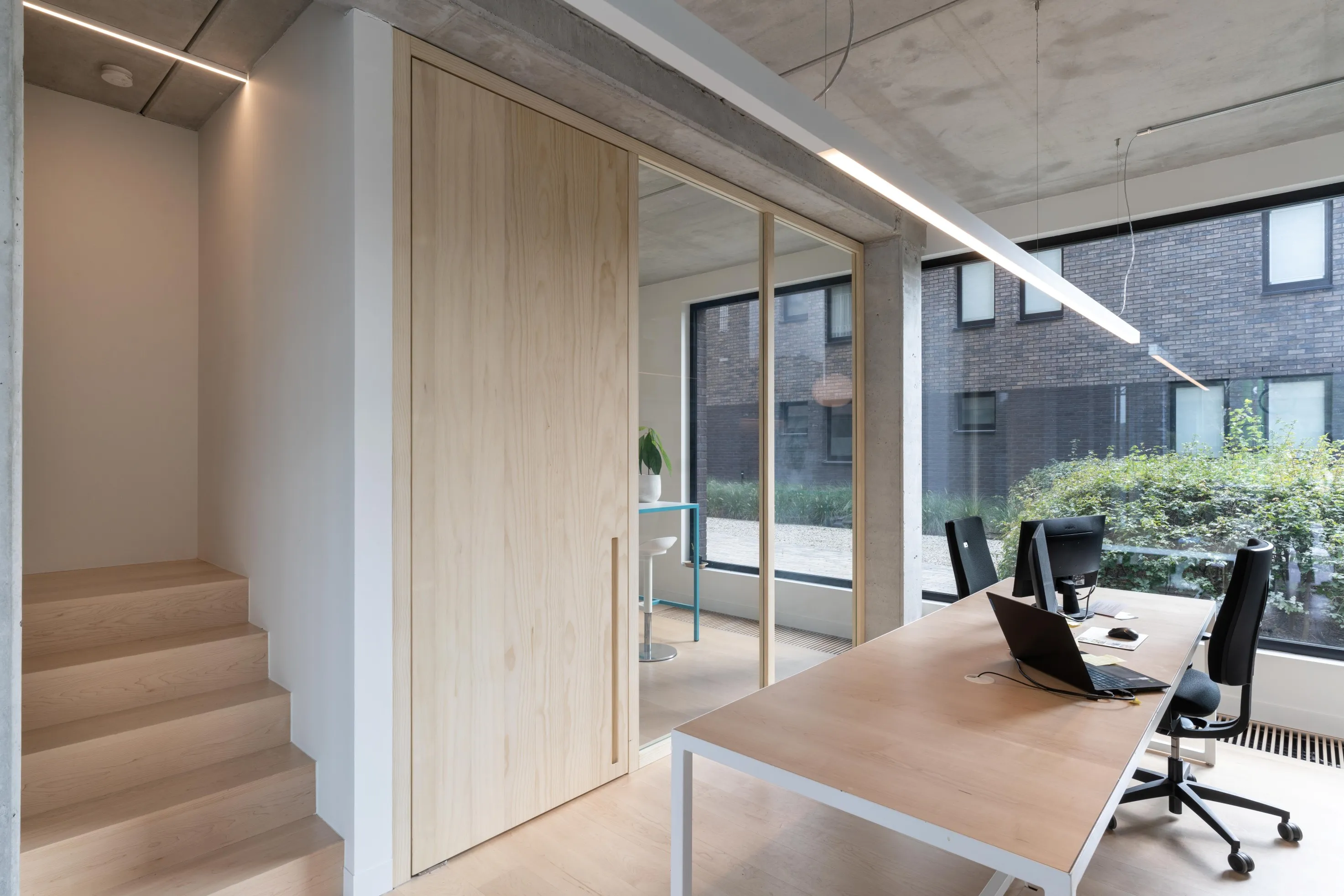 Door gebruik te maken van glazen scheidingswanden, waar nodig uitgevoerd in figuurglas voor discretie, wordt ruimtelijke versnippering voorkomen en voelt het geheel groter aan dan de beschikbare footprint.