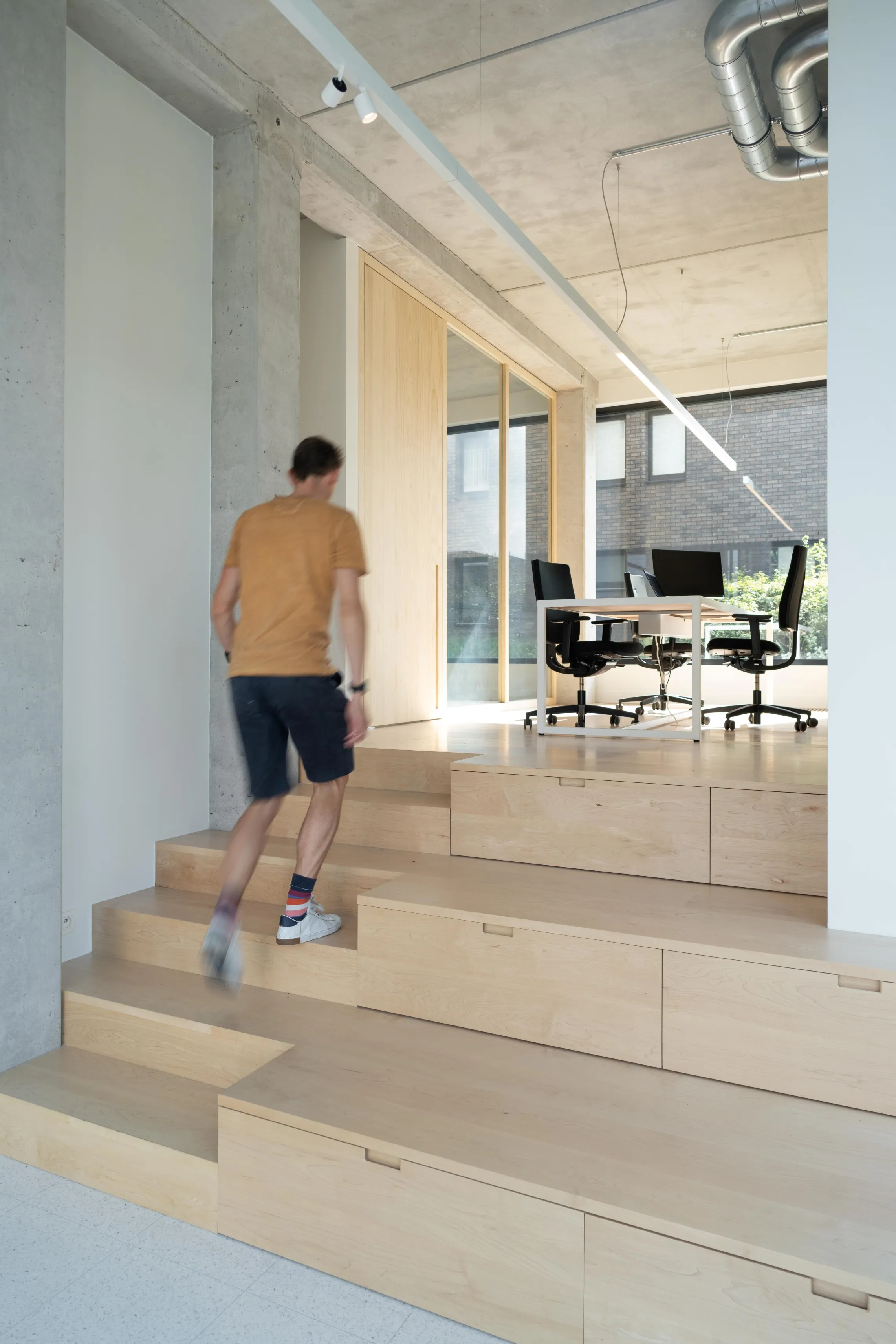 Door centraal een kern te voorzien met sanitair, technieken en berging, kunnen daarrond logisch de verschillende actieve functies georganiseerd. Het pasverschil tussen straat en binnengebied wordt als een ruimtelijke kwaliteit uitgespeeld: kantoor en kitchenette worden achteraan op hoogte georganiseerd waardoor de visibiliteit vergroot.