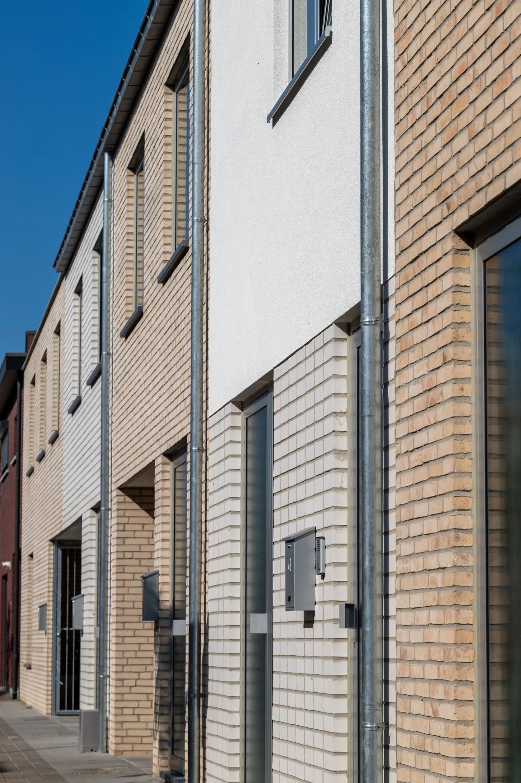 Het ritme in de gevels is repetitief opgevat, het materiaalgebruik subtiel variërend. De wisselende metselwerkverbanden en dakbedekkingen versterken het individuele aspect van de woningen waardoor het groepswoningbouwproject zich subtiel in het straatbeeld inpast.