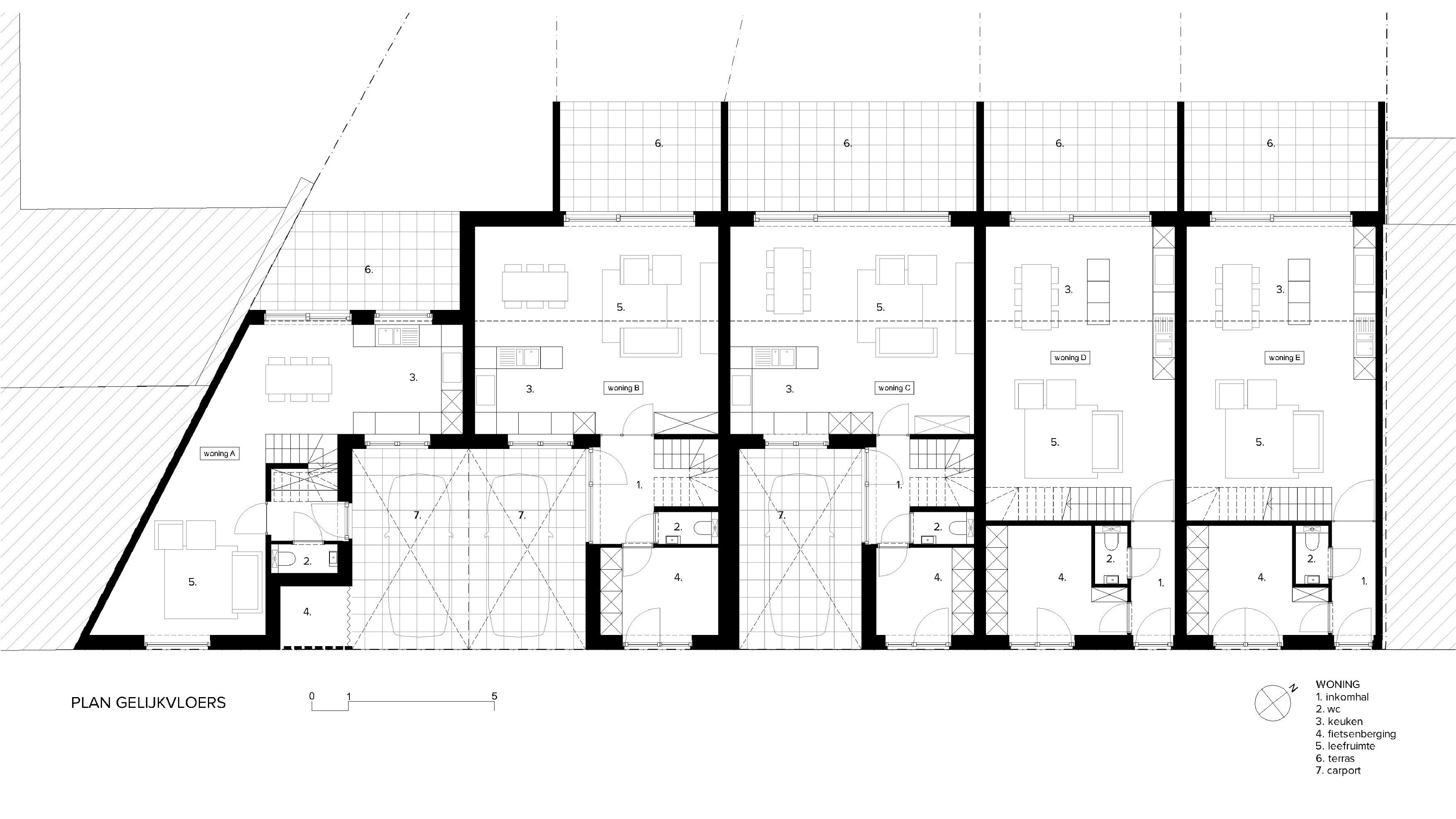 Om te voldoen aan de parkeernorm wordt gewerkt met carports. Deze brengen de leefruimtes in contact met de straat, wat de plint van deze bebouwing levendig houdt. De grens publiek – privaat wordt hierdoor minder streng.