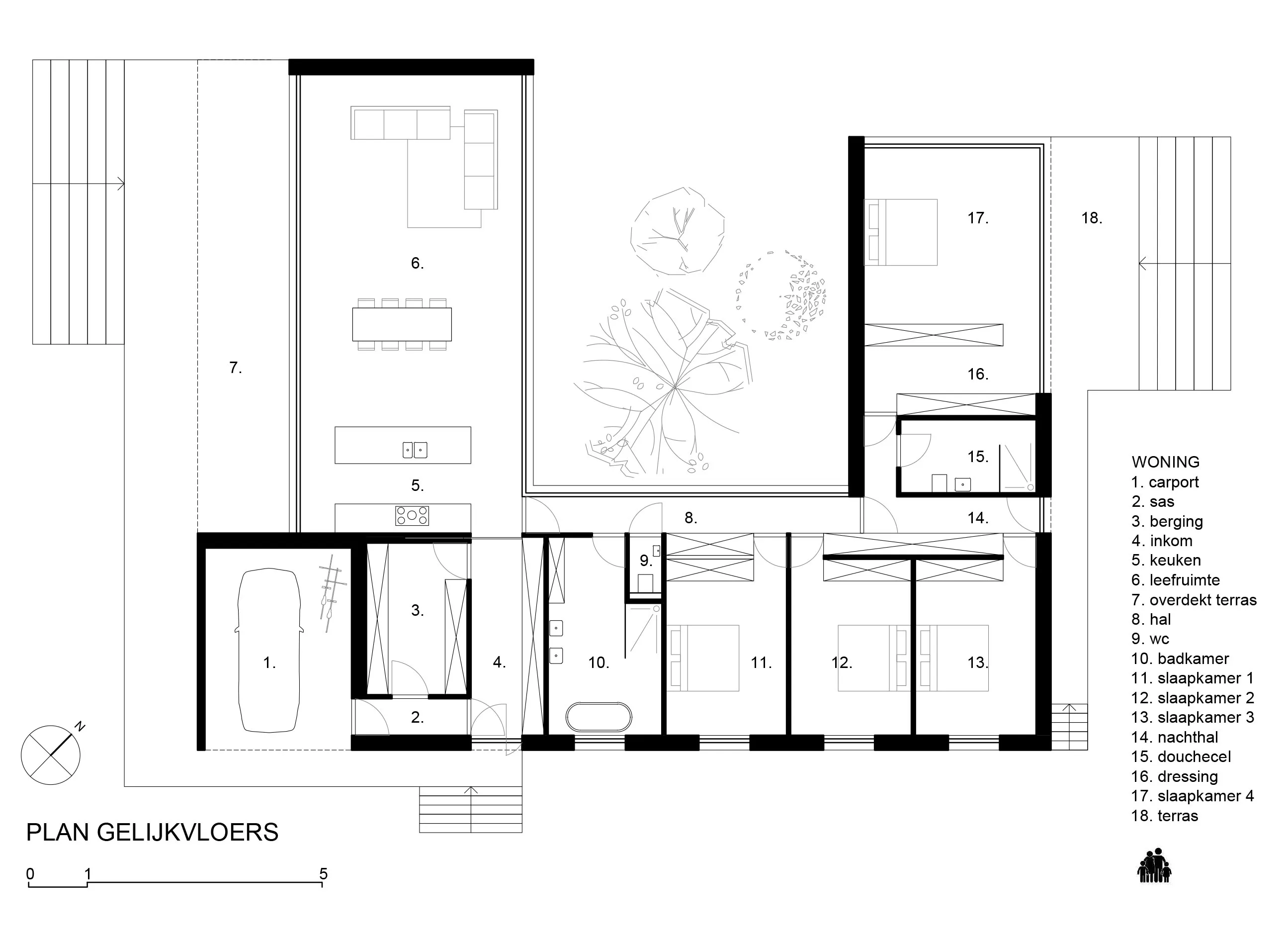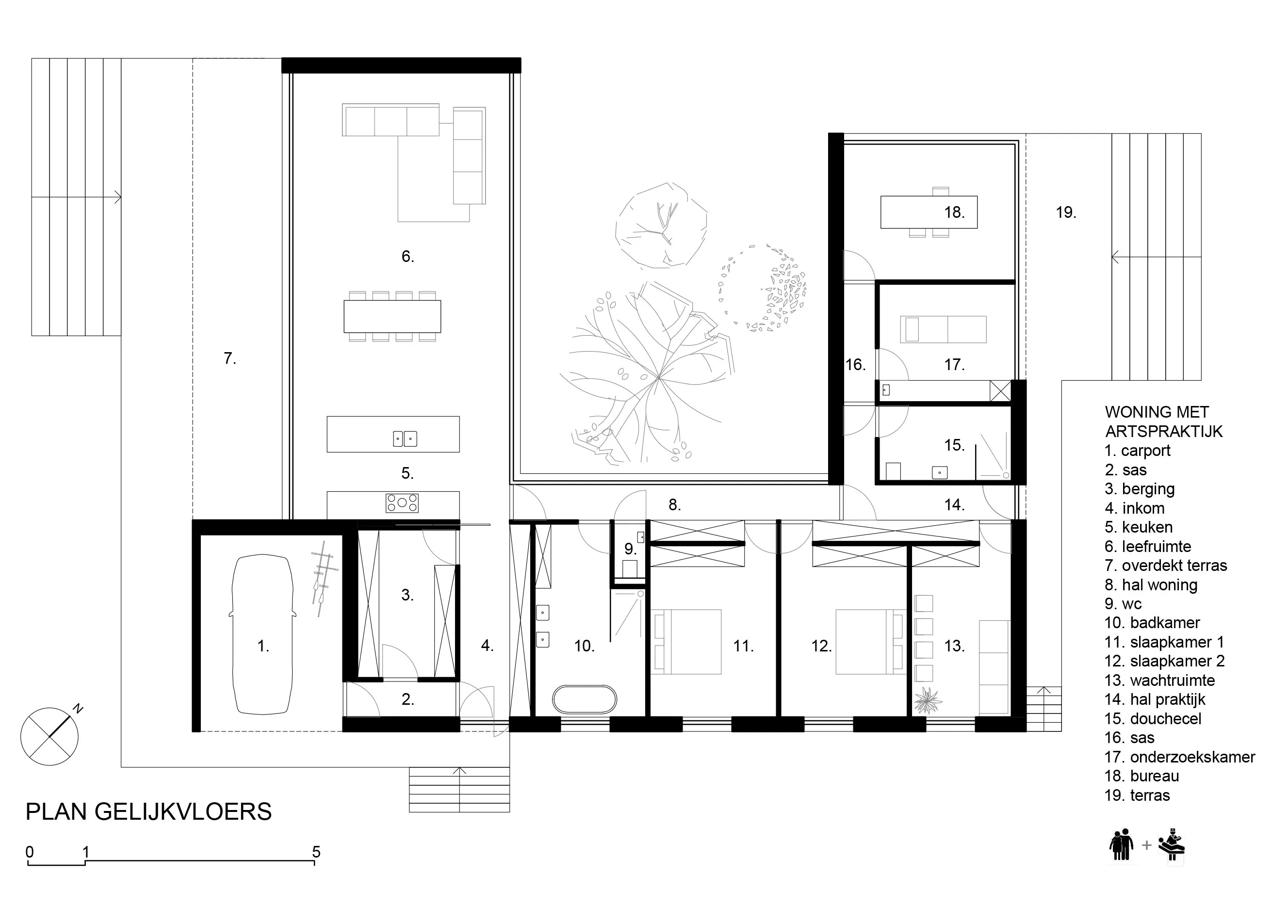 Het gebouw strekt zich uit over één bouwlaag rond een halfopen patio en kan zowel een gezin met 3 kinderen huisvesten als een woning worden met apart toegankelijke praktijkruimte of met geïntegreerde zorg- / B&B-unit.