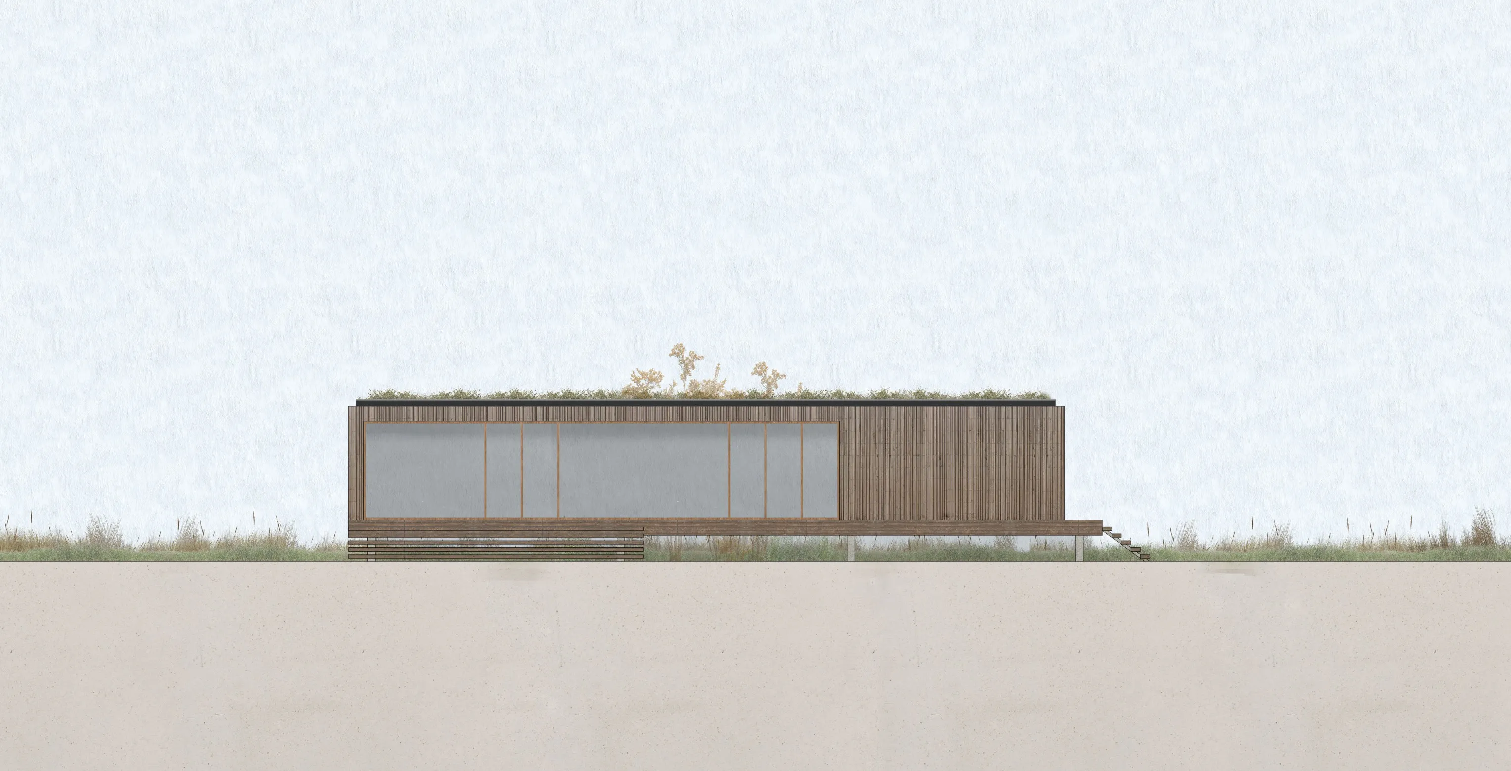 De woning wordt op schroefpalen geplaatst opdat er geen betonfundering nodig is, kleine dieren vrije doorgang krijgen en er ook vanuit de sofa een uitzicht boven de wuivende maïsvelden ontstaat.