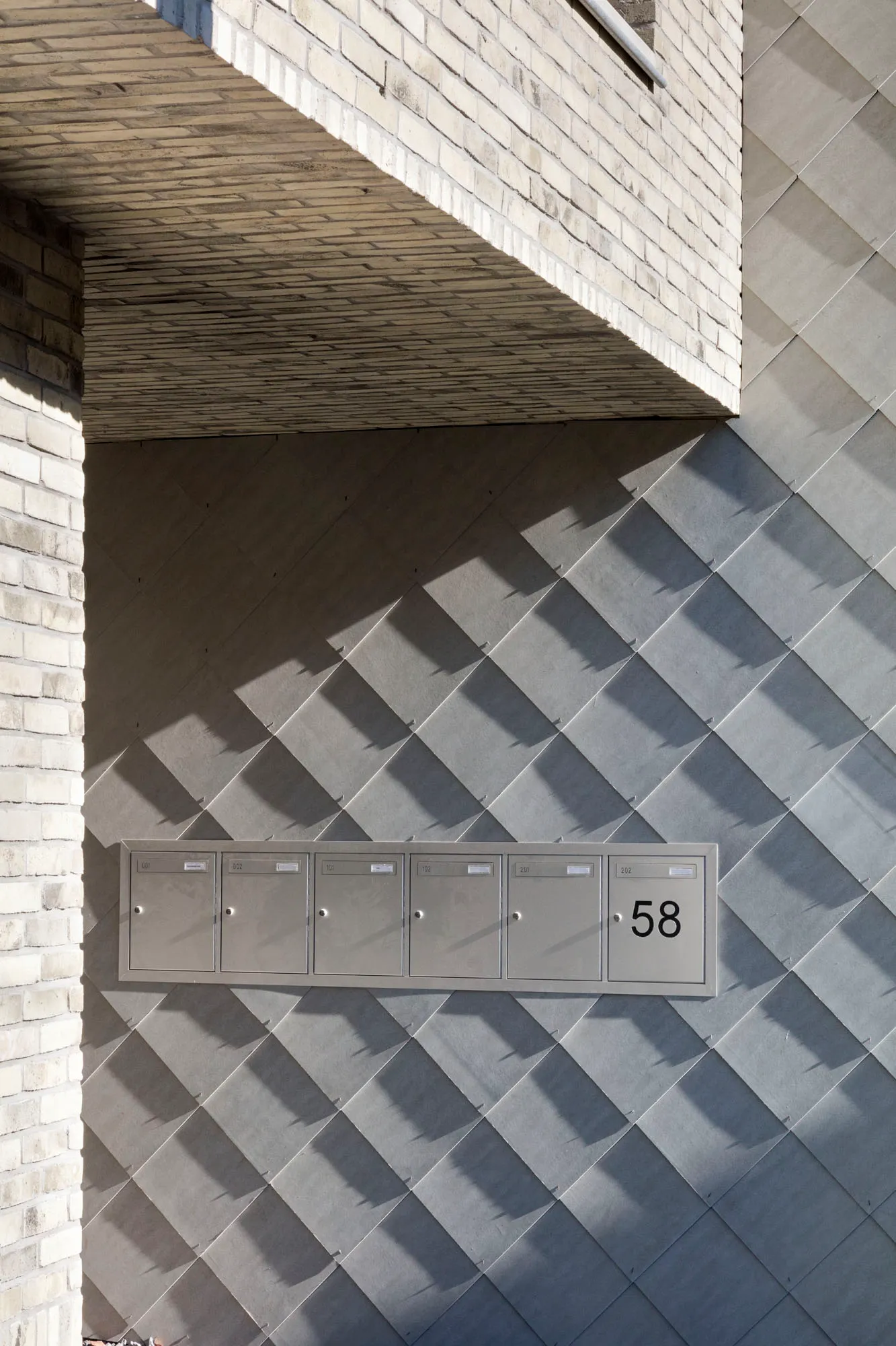 De drie gevels worden op een evenwaardige manier voorzien in traditioneel metselwerk. De repetitie in de openingen, de subtiele doch rijkelijke materialen en de eigenzinnige vormgeving van de balustrades getuigen van een nieuwe ambachtelijkheid.