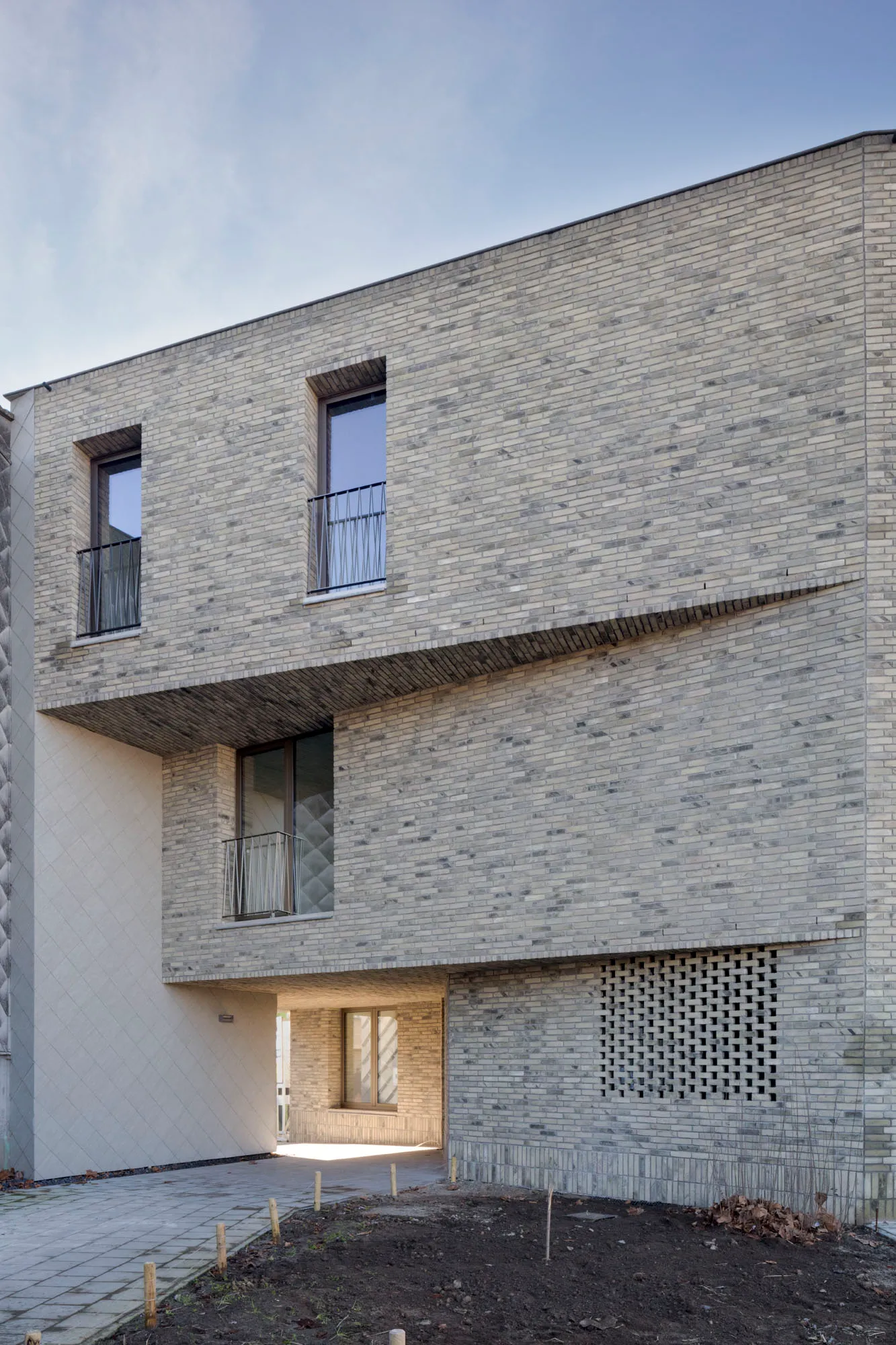 Vanuit de vorm van het perceel en het zoeken naar een kwalitatieve doorsteek wordt het gebouw samengesteld uit drie geroteerde bouwlagen. Op het gelijkvloers ontstaat een brede en dubbelhoge ruimte met doorzichten tussen straat en binnengebied, een uitnodigende link die zich tevens laat lezen in het profiel van de gevels.
