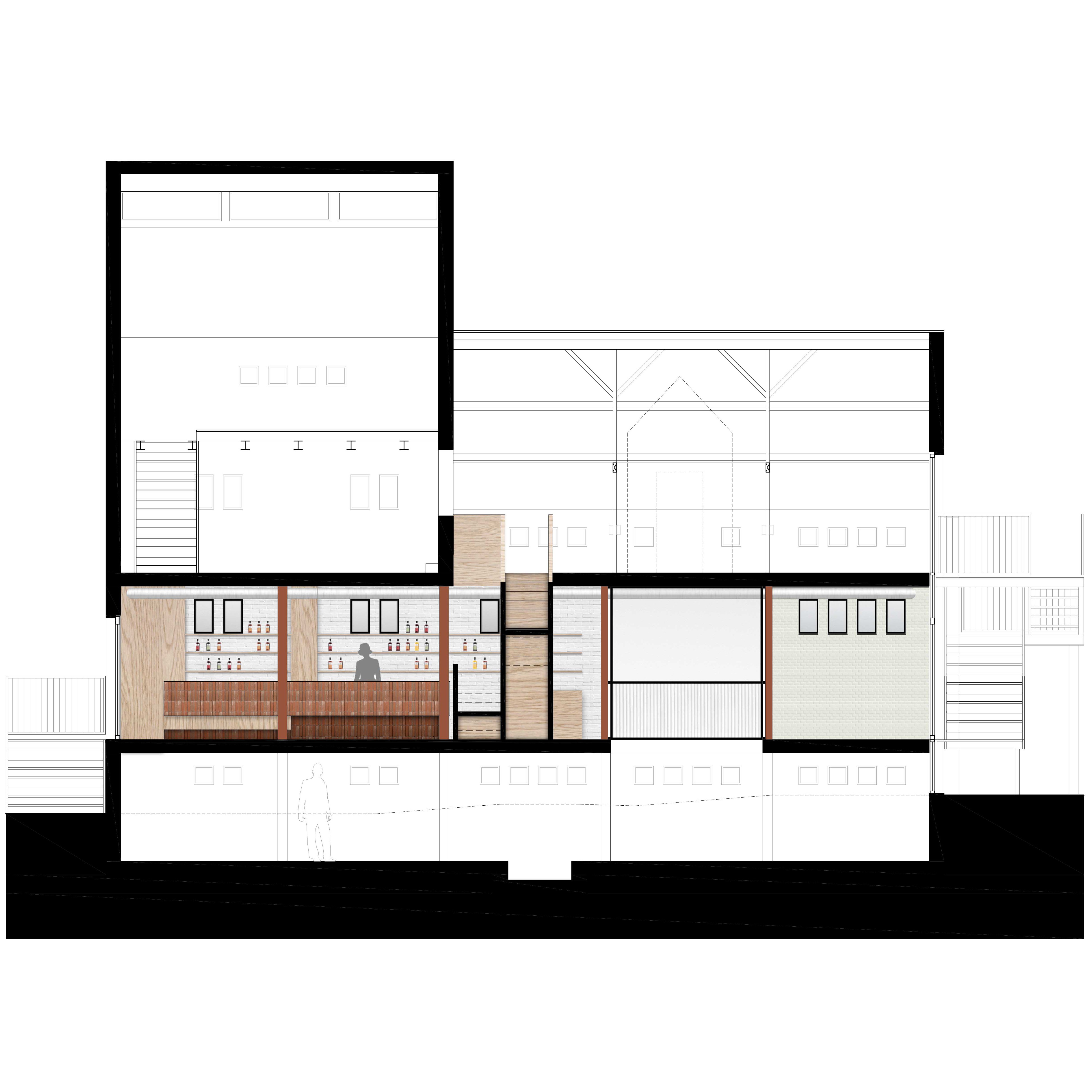 Vanuit de winkel- en degustatieruimte wordt de productiefaciliteit met zijn prachtige koperen ketels zichtbaar. De distillatie- en maceratieprocessen lopen verder door in de kelderruimte waar het natuurlijk licht nu diep kan doordringen en het aangenaam werken is.