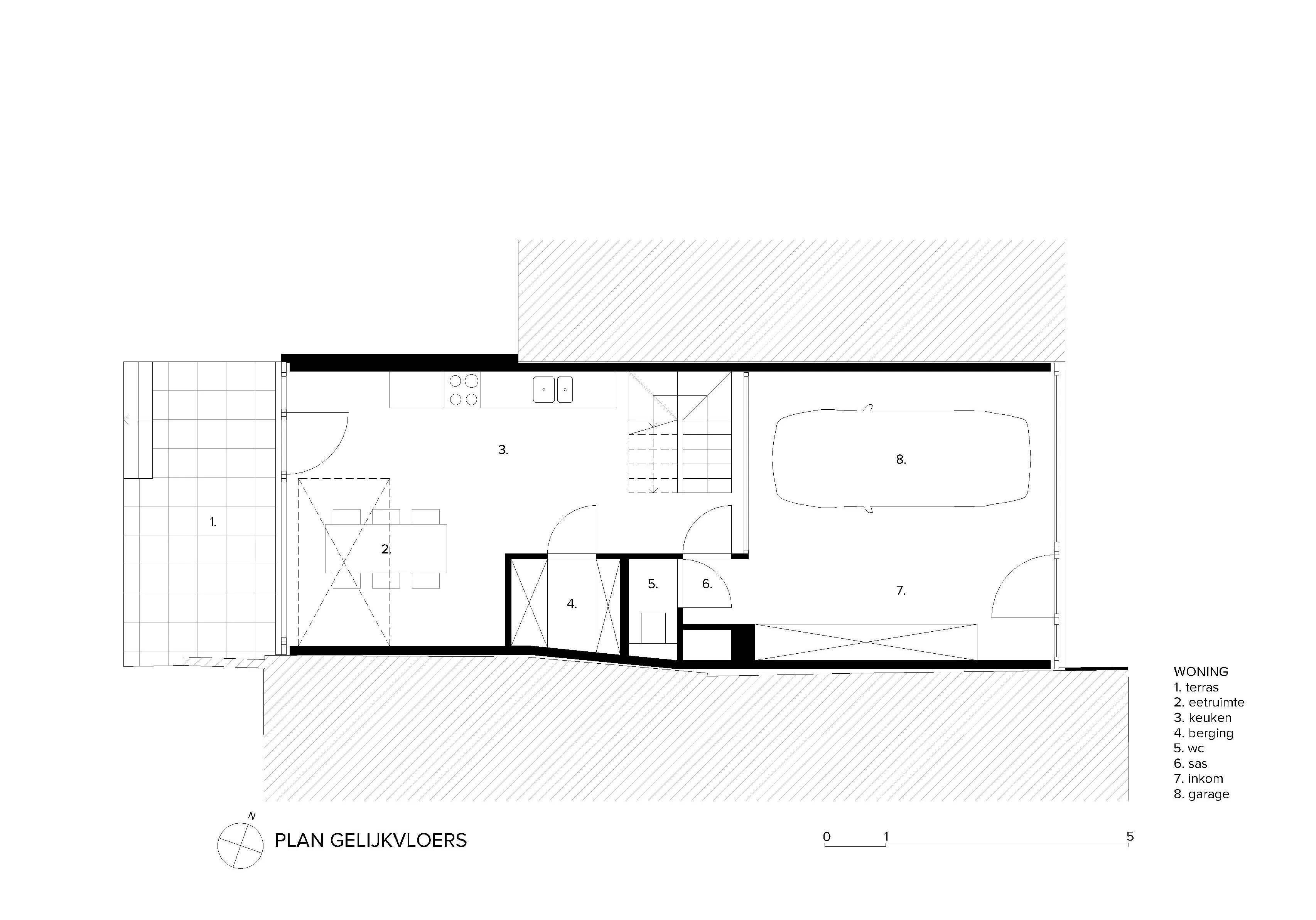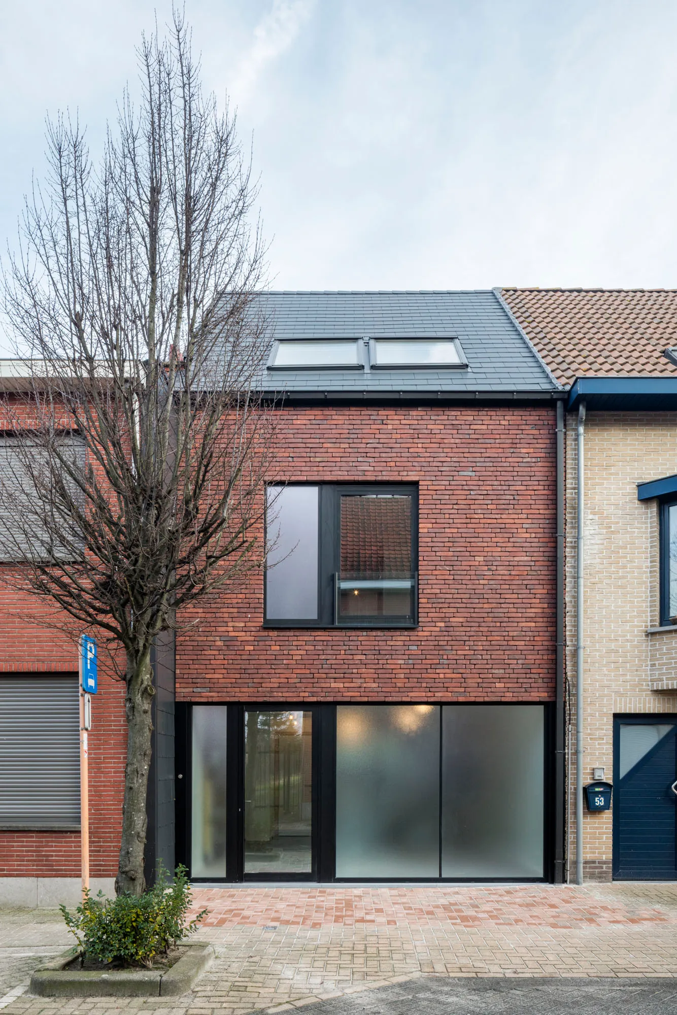 Een budgetvriendelijke rijwoning vervangt een verkrotte constructie op een vijf meter breed perceel. Binnen de maximale bouwdiepte wordt er gezocht naar een kwalitatieve integratie van een auto-/fietsberging.