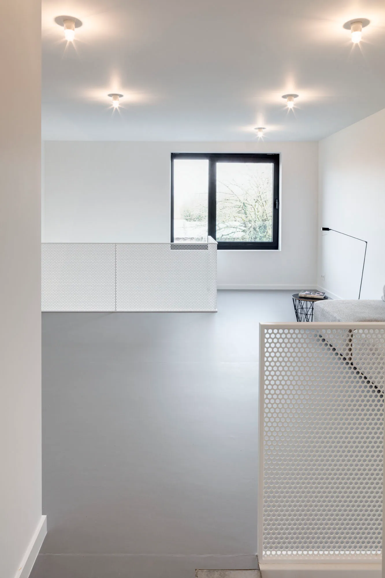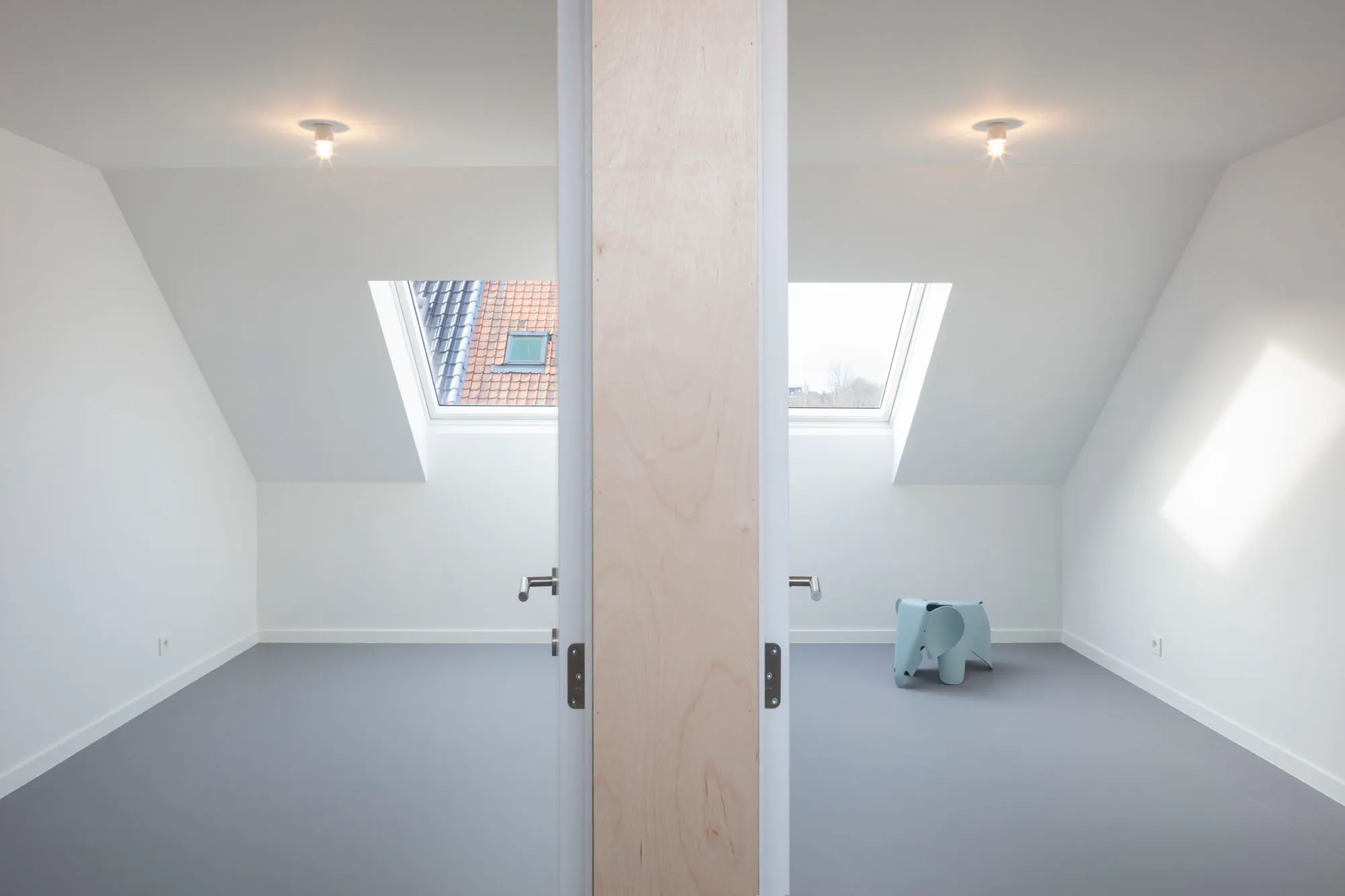 Het interieur wordt sober en rationeel uitgewerkt, met beton en multiplex als verbindende elementen.