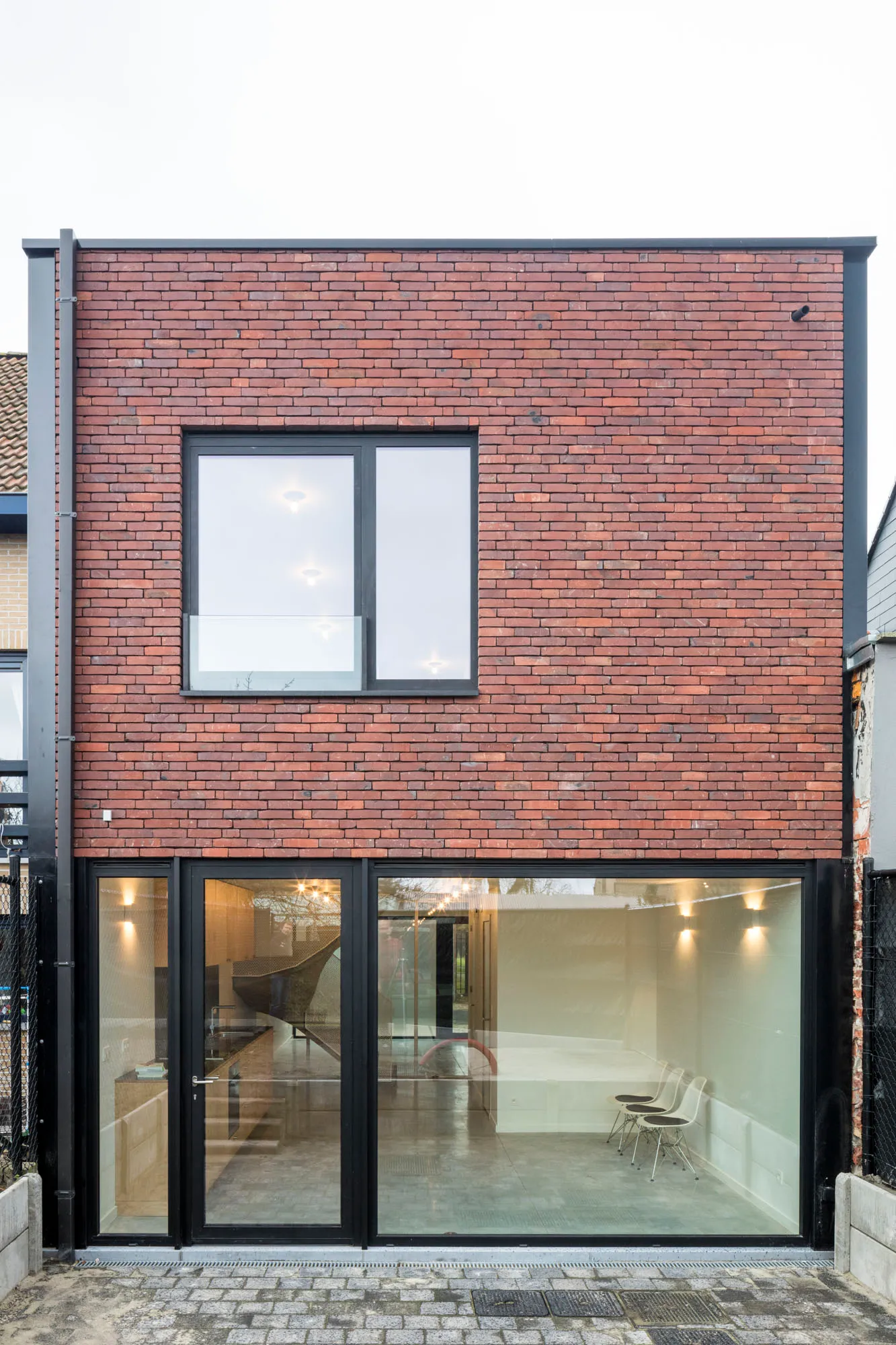 Voor- en achtergevel worden evenwaardig uitgewerkt: een glazen plint met daarboven klassiek metselwerk, het dak in leien verbindt de verschillende vrijstaande delen van scheimuren aan voor- en achtergevel.